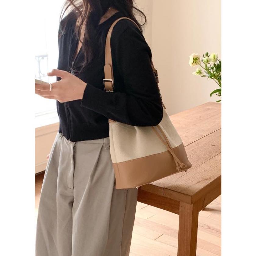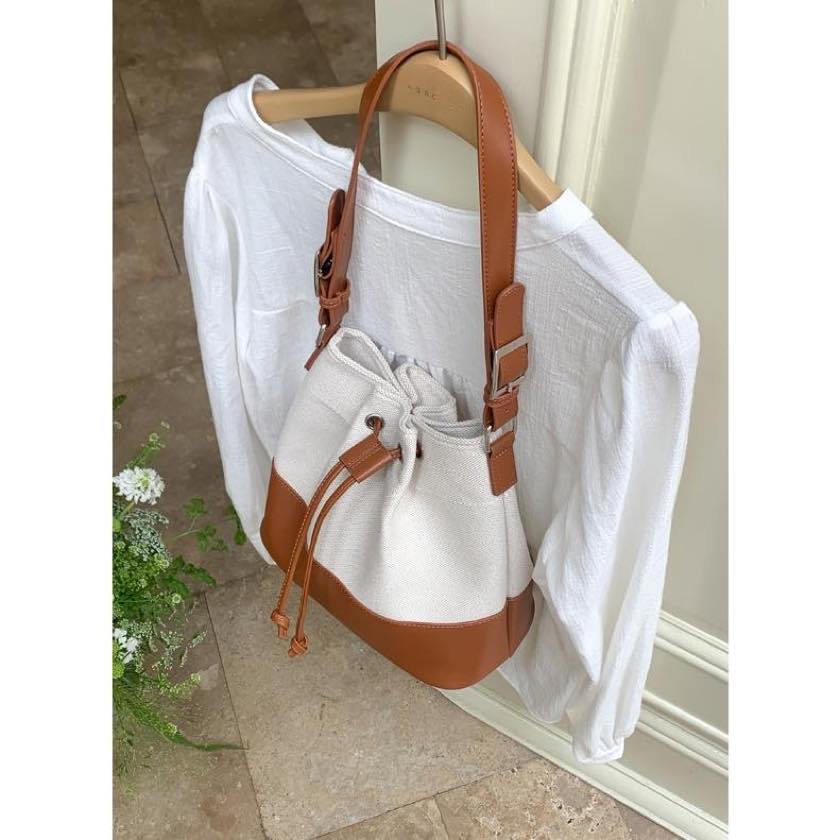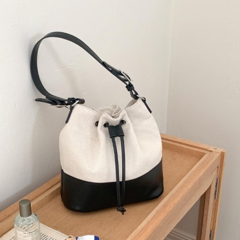 ナチュラルなキャンバス地とフェイクレザーの2トーンで、大人コーデのアクセントにぴったりの巾着ショルダーバッグ。