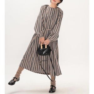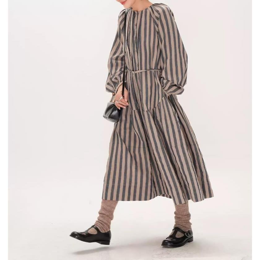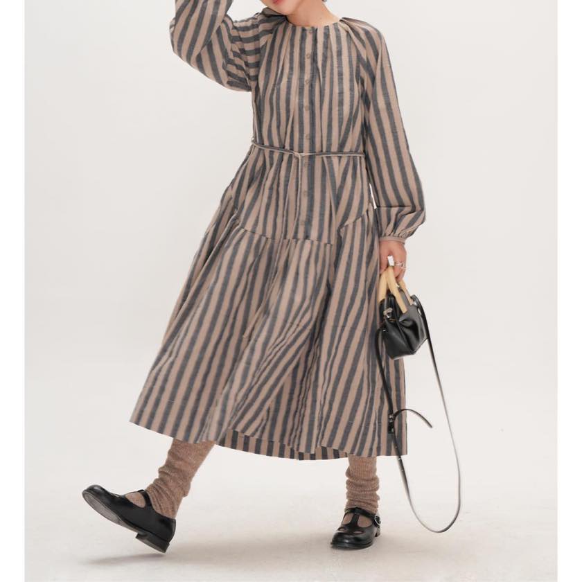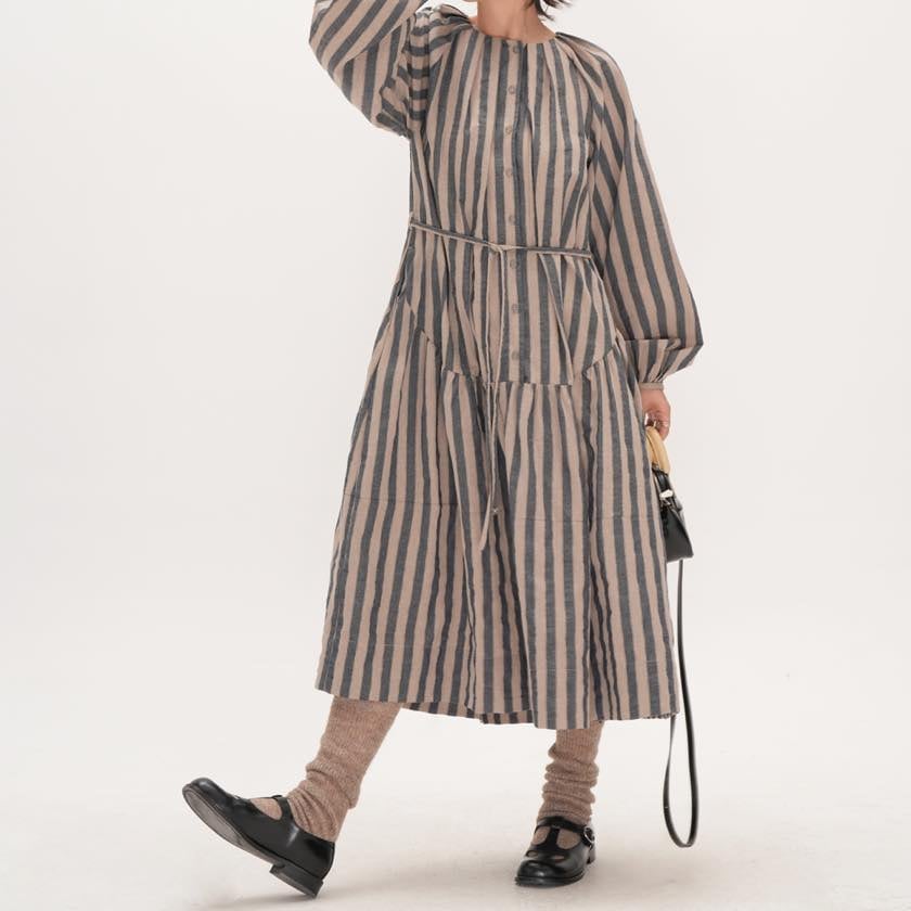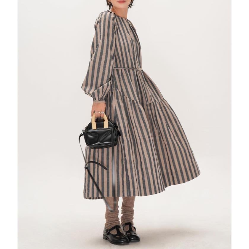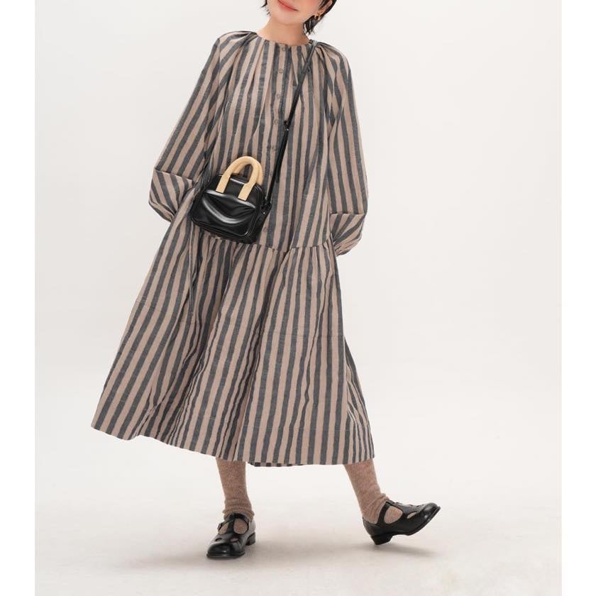 グレー×ベージュの落ち着いたトーンのストライプが映える、大人のワンピース。