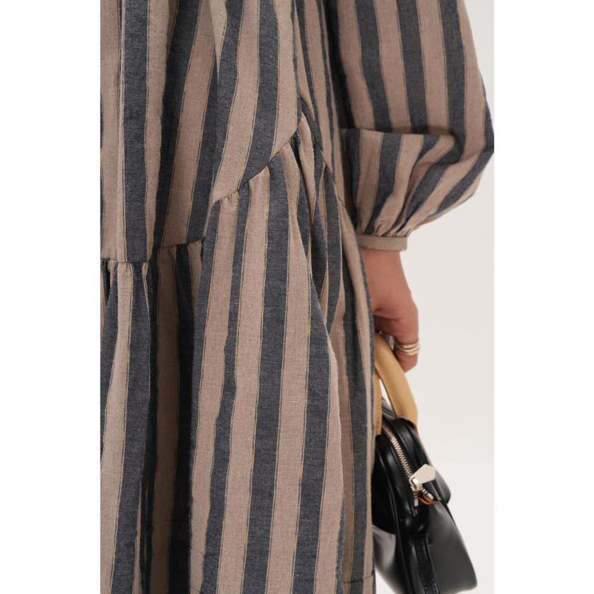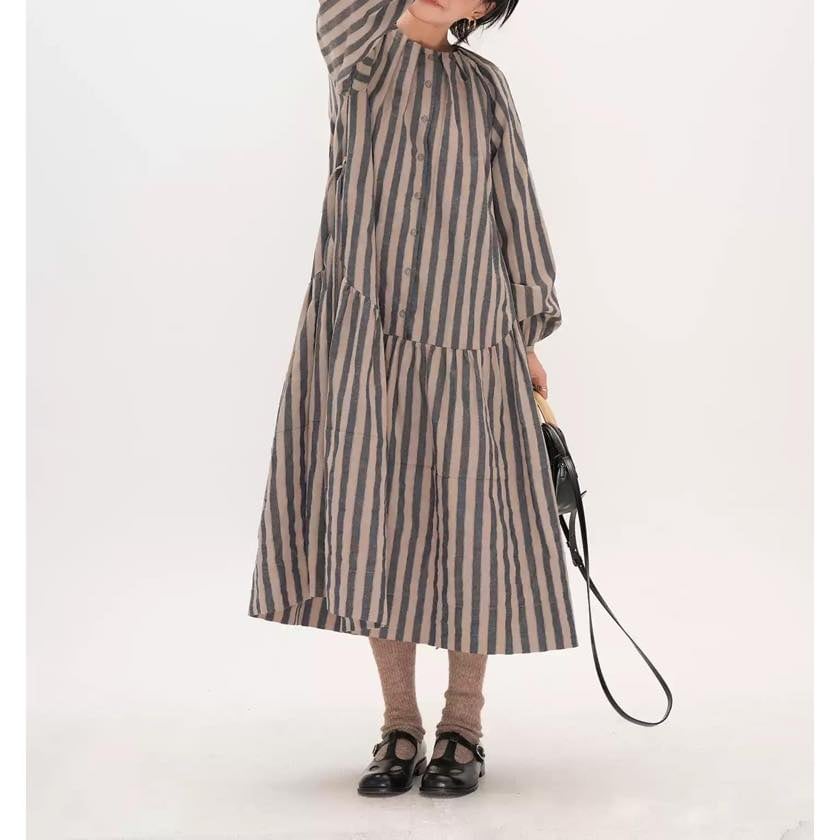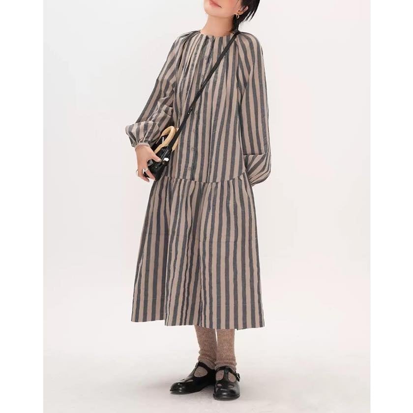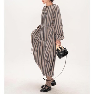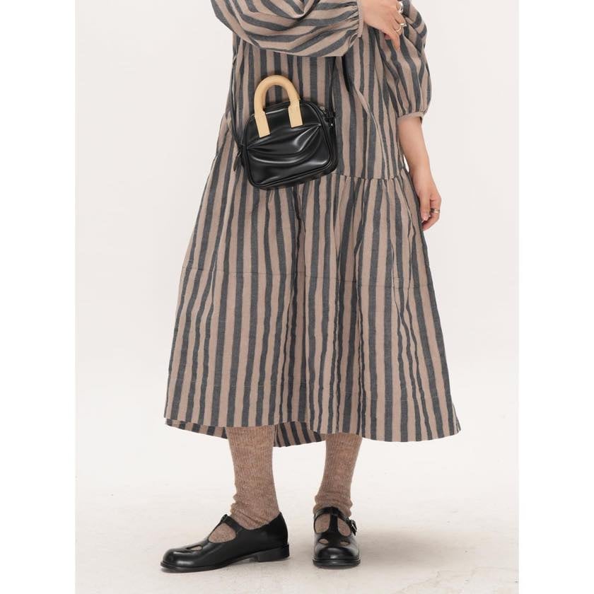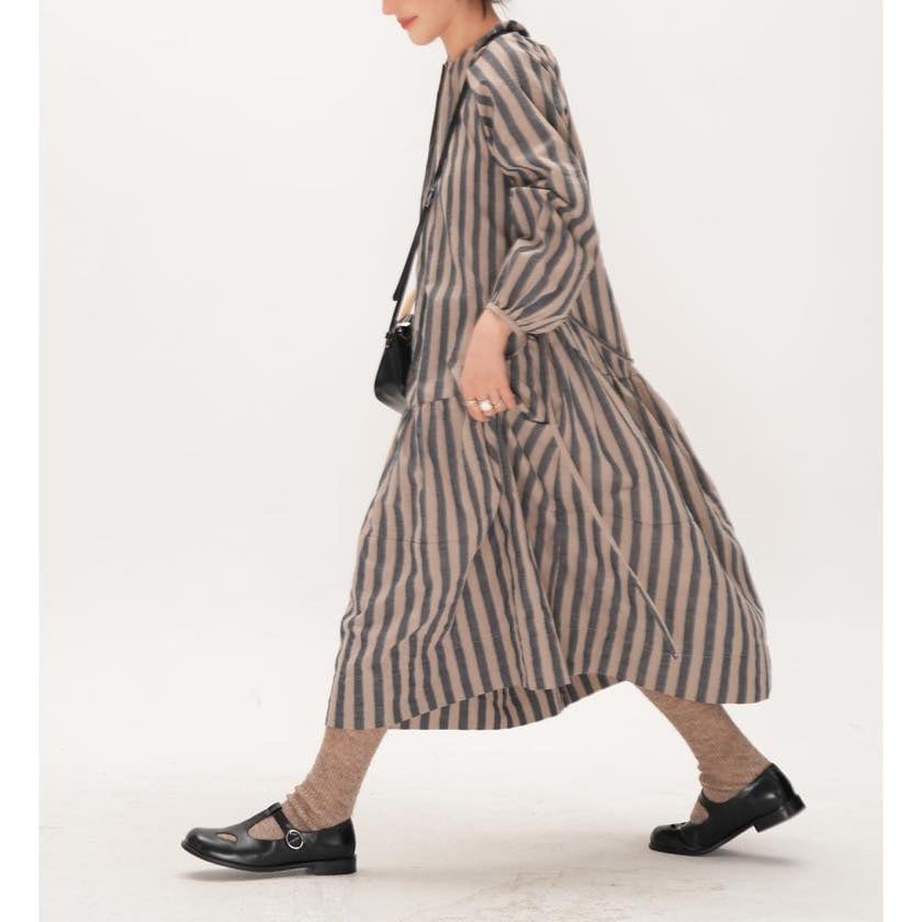 グレー×ベージュの落ち着いたトーンのストライプが映える、大人のワンピース。