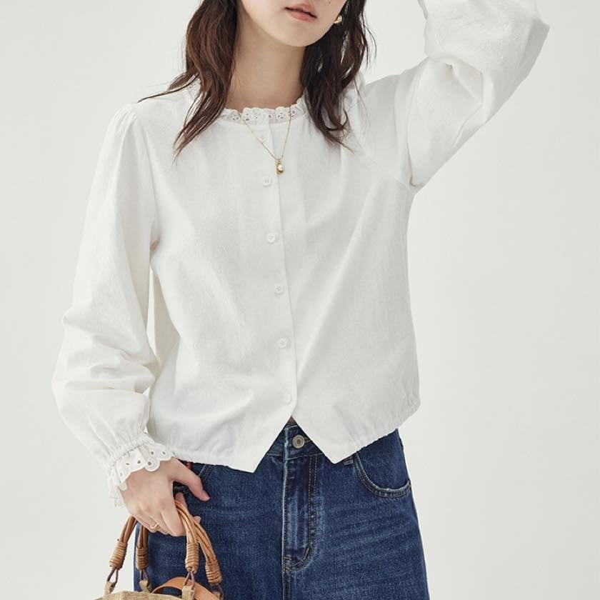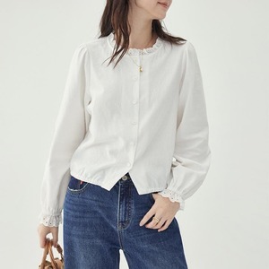 首元や袖口のレースフリルとも相まって、品よく女性らしい印象に。