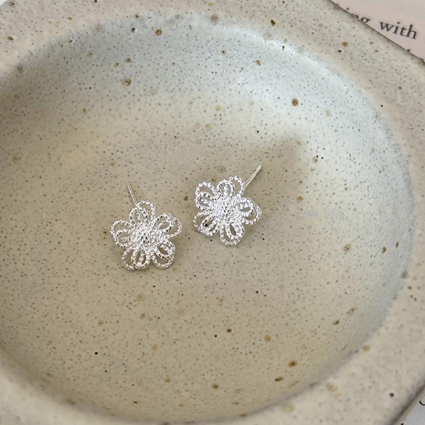 繊細なシルバーのラインが重なる花びらが、耳元を可憐に彩るピアス。