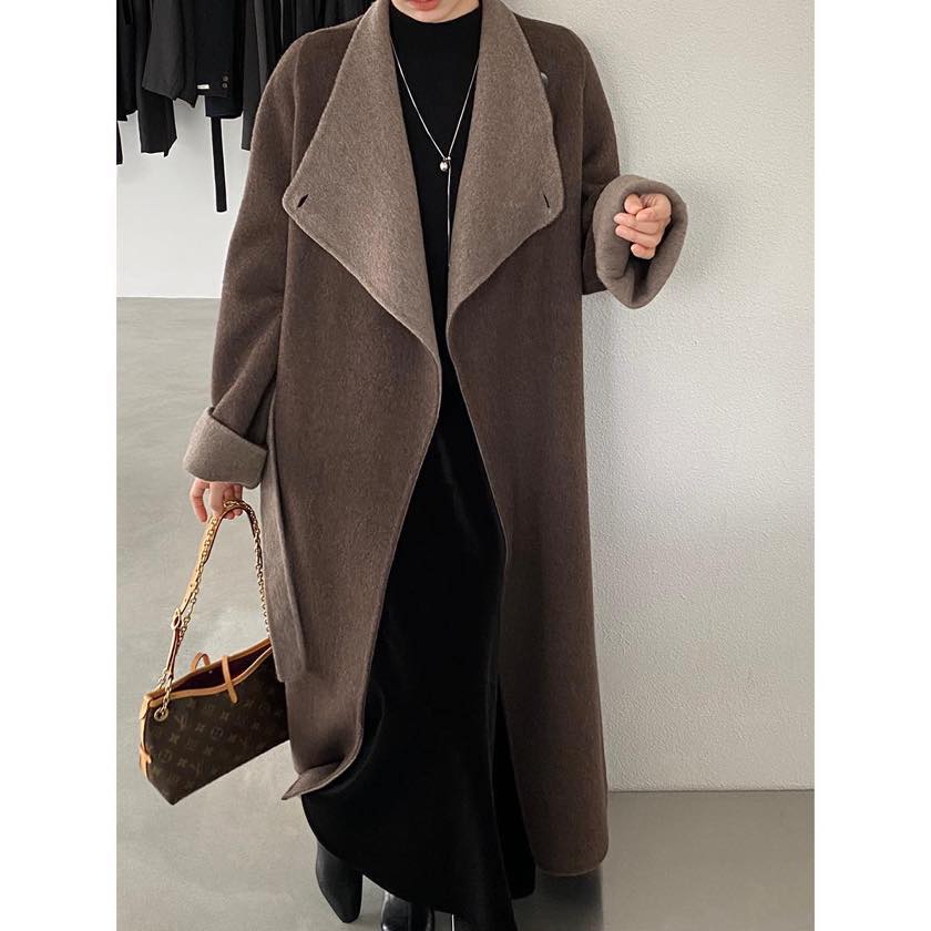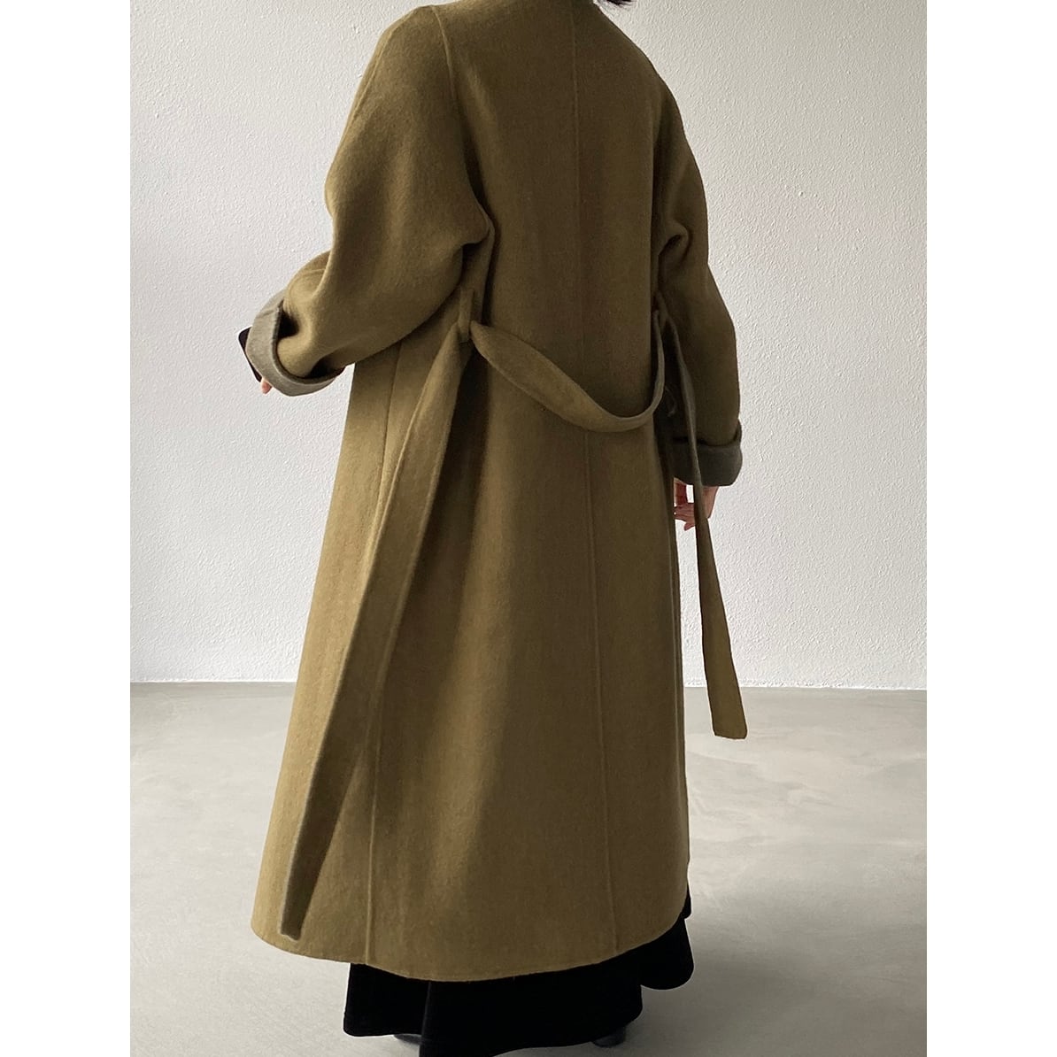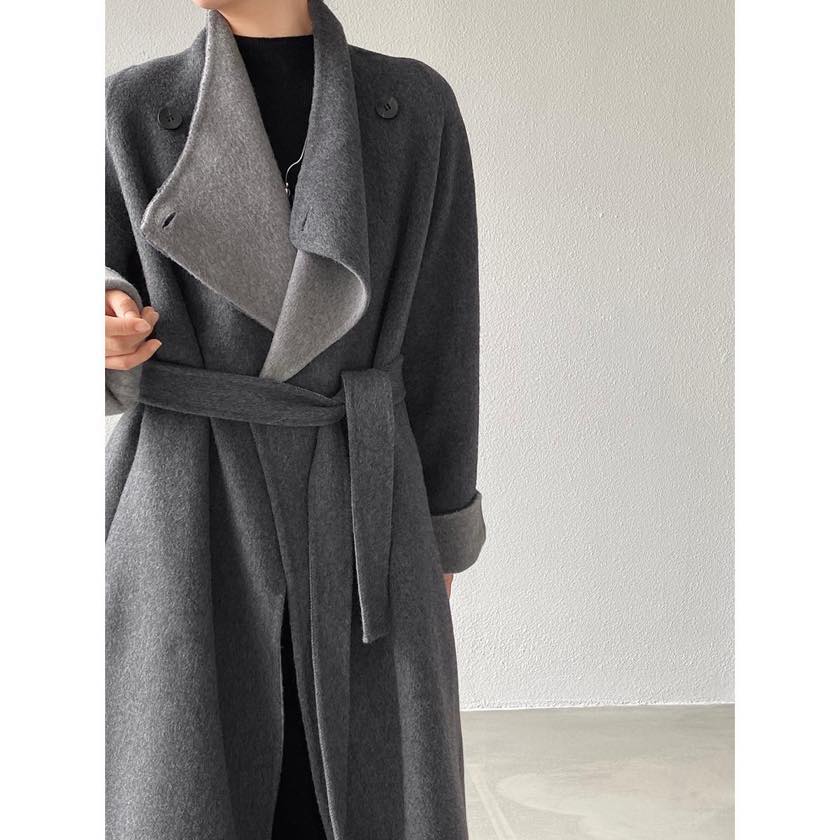 ドレープ感のあるシルエットと、上品な配色を楽しむロングコート。