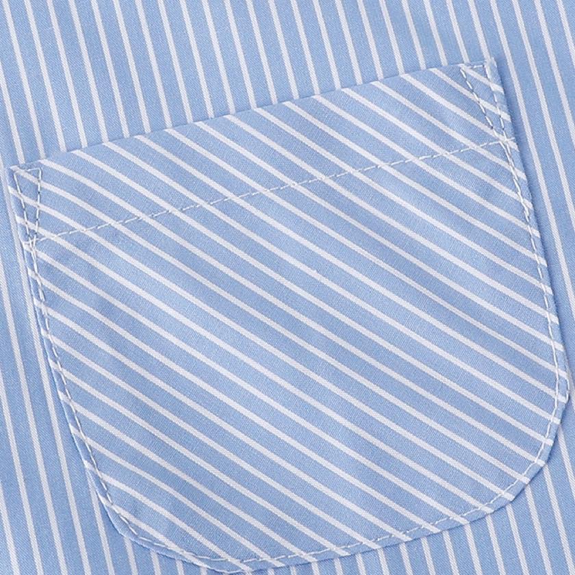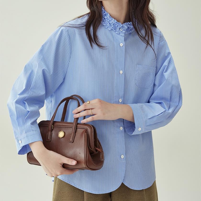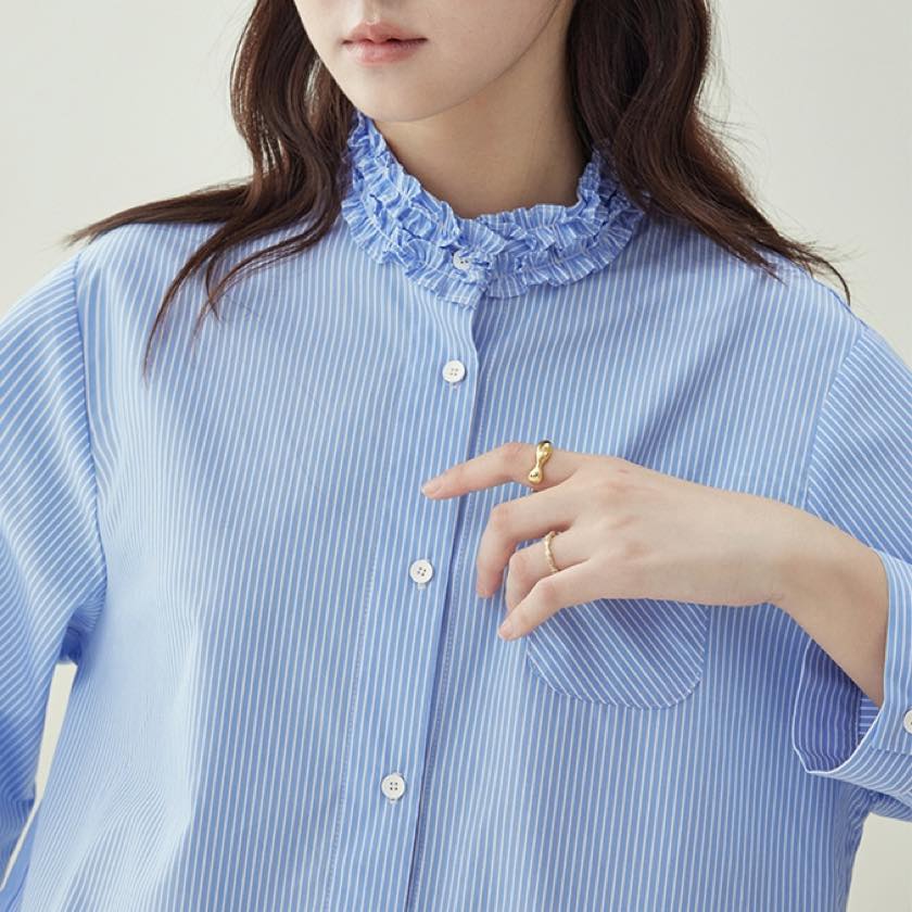blue stripe frilled stand-collar shirt
