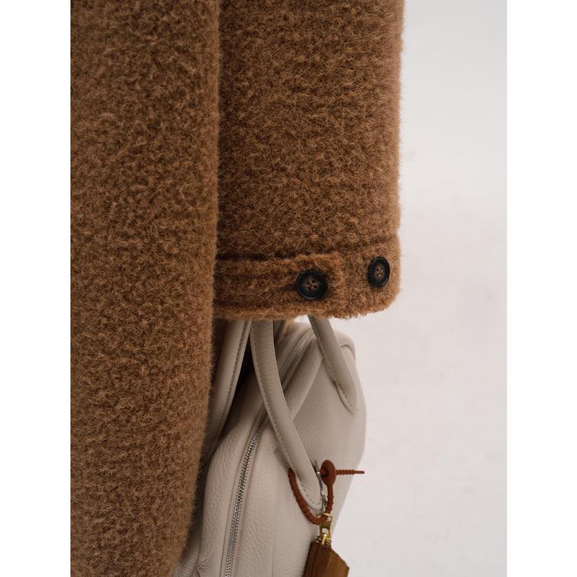 ふんわりとしたボア素材が、冬の装いに優しいぬくもりを添えるコート。