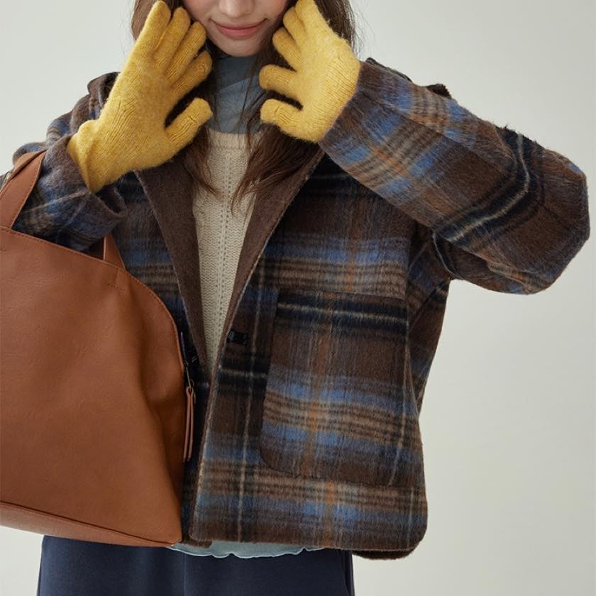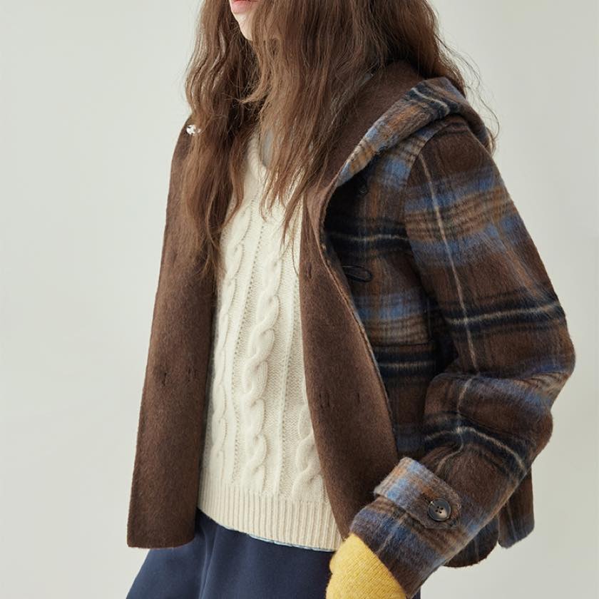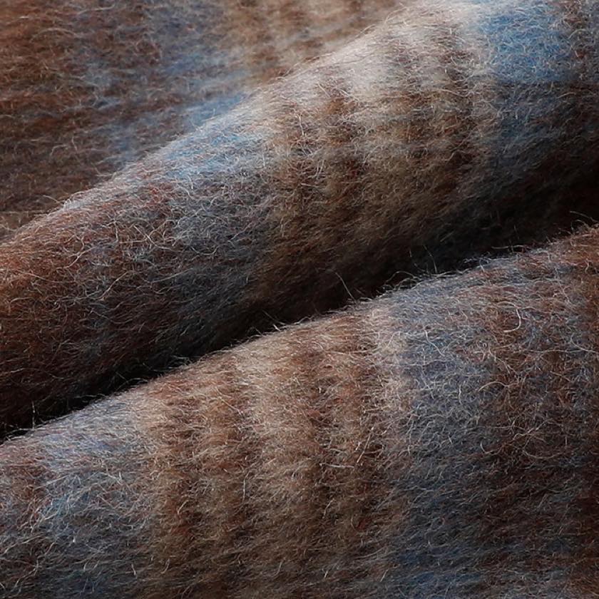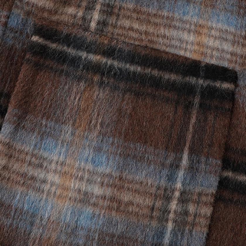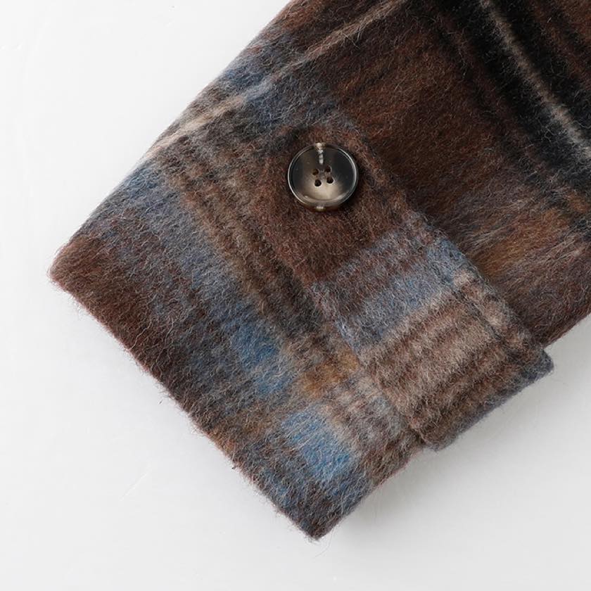 深みのあるブラウンに静かなブルーが息づく、穏やかな配色が魅力のコート。
