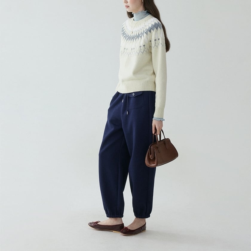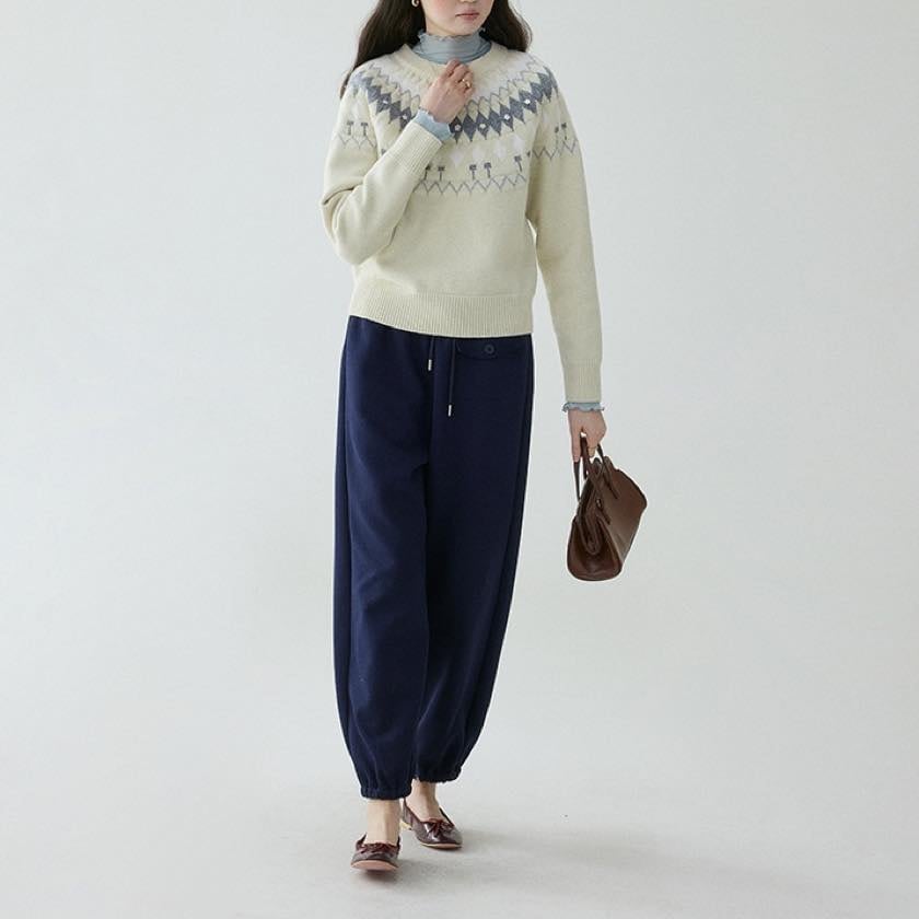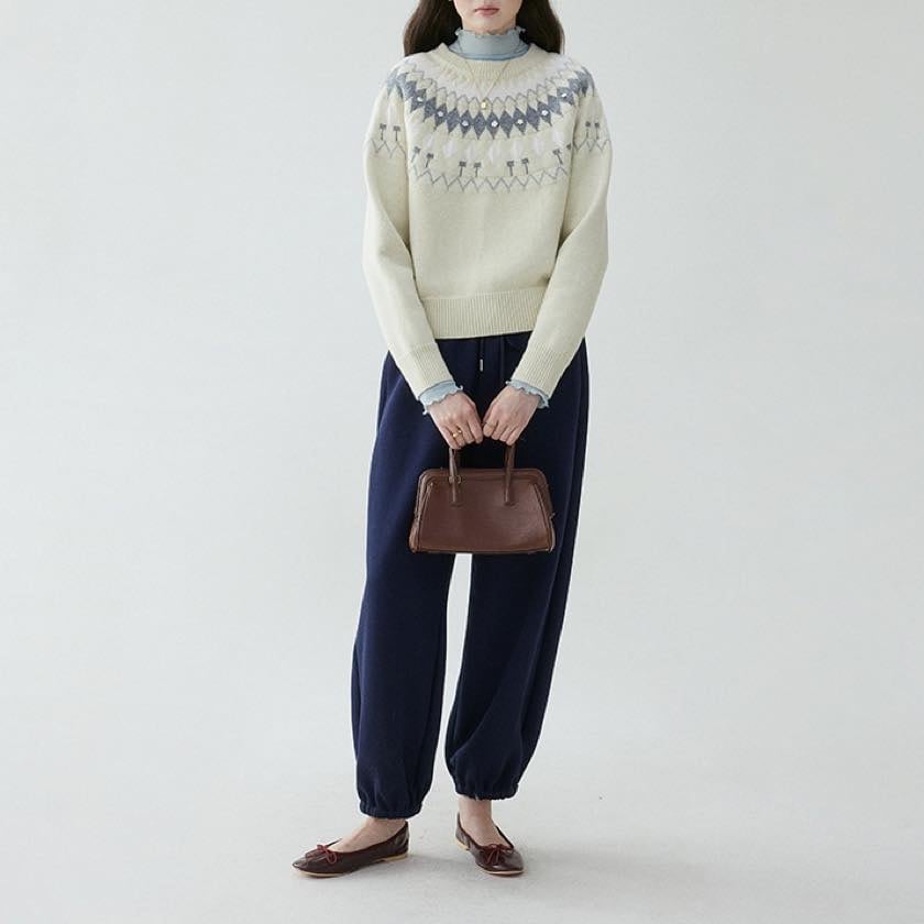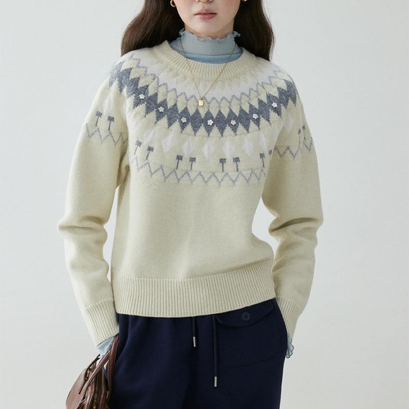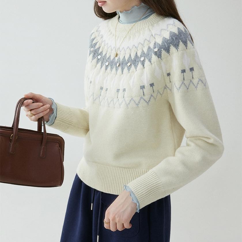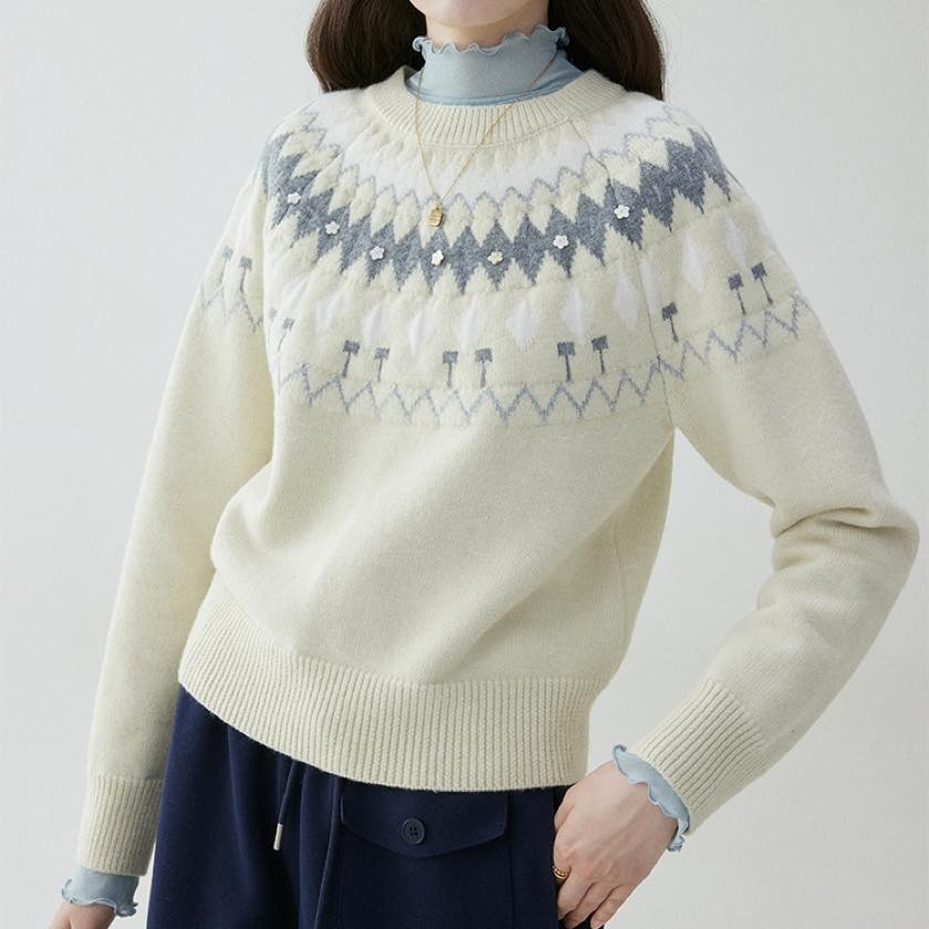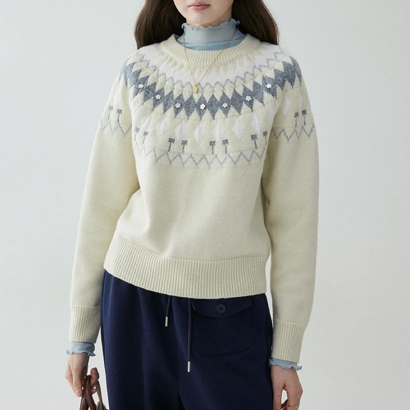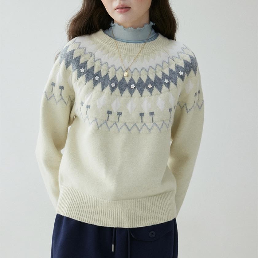 やさしい色合いに、小さなお花のアクセントが可愛いノルディックニット。