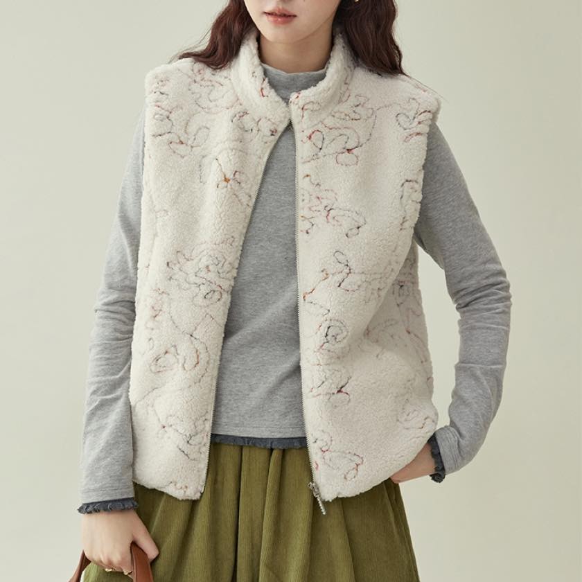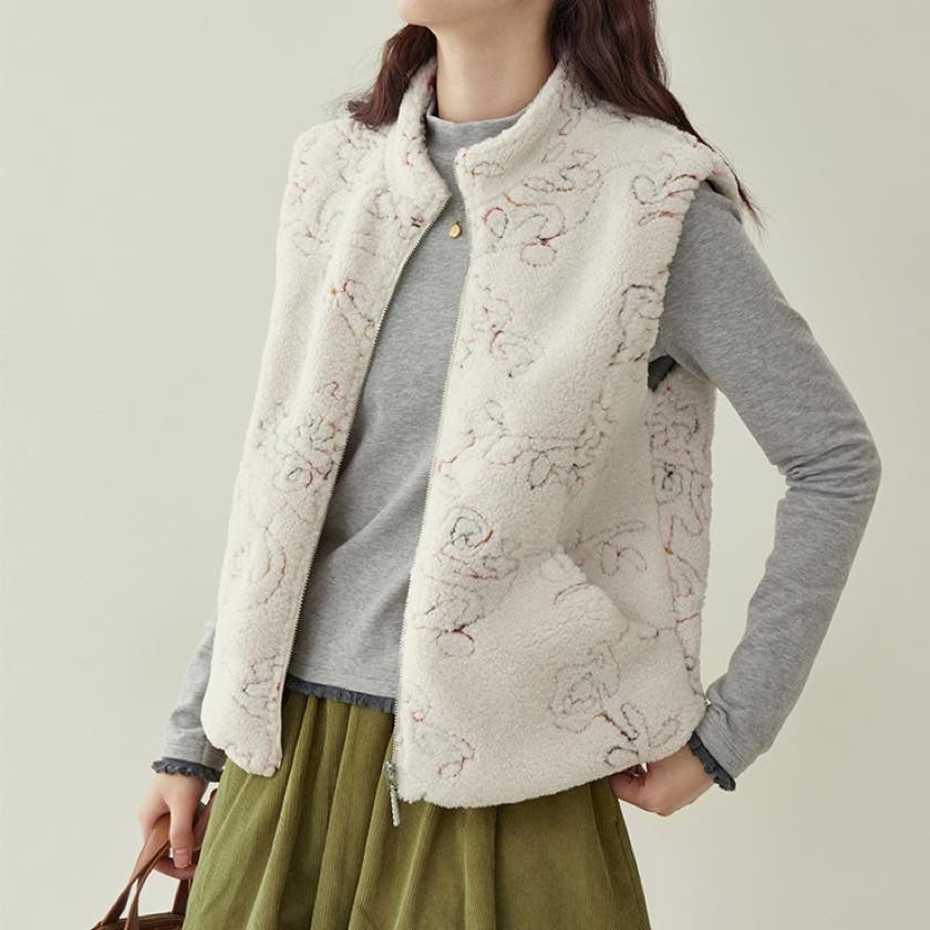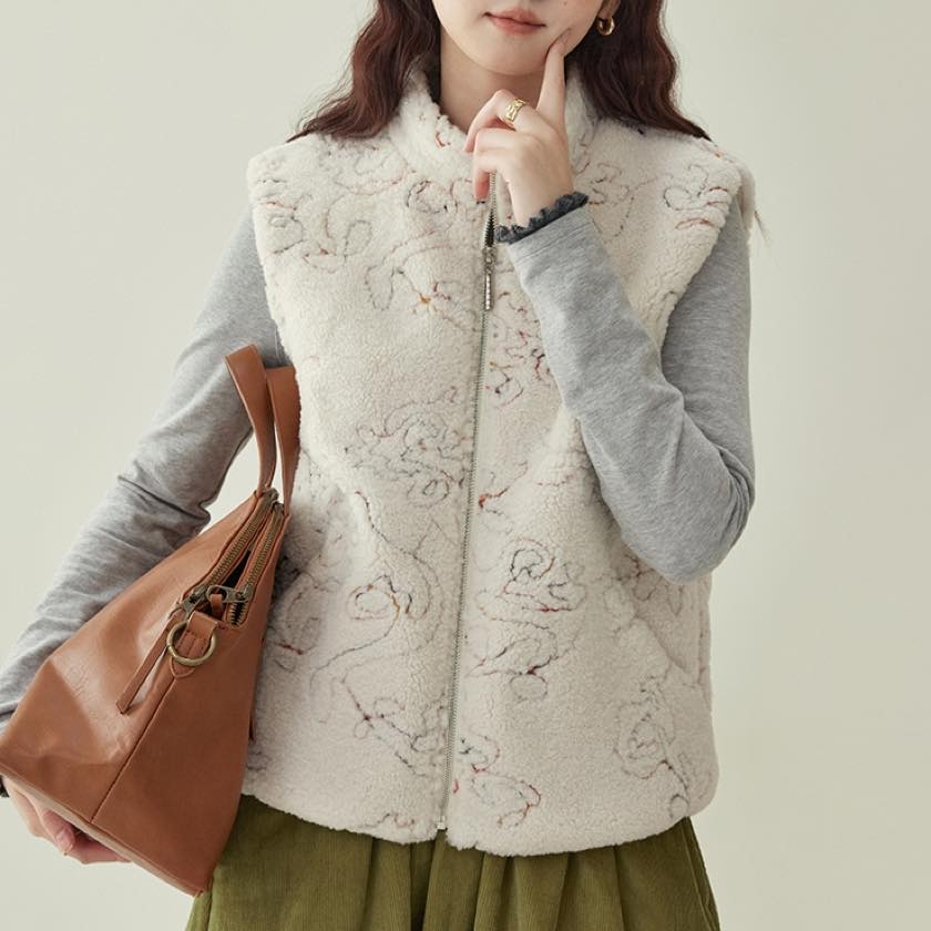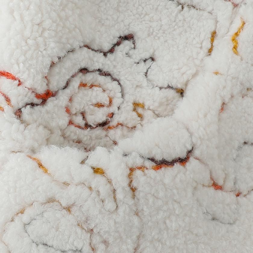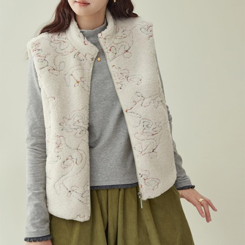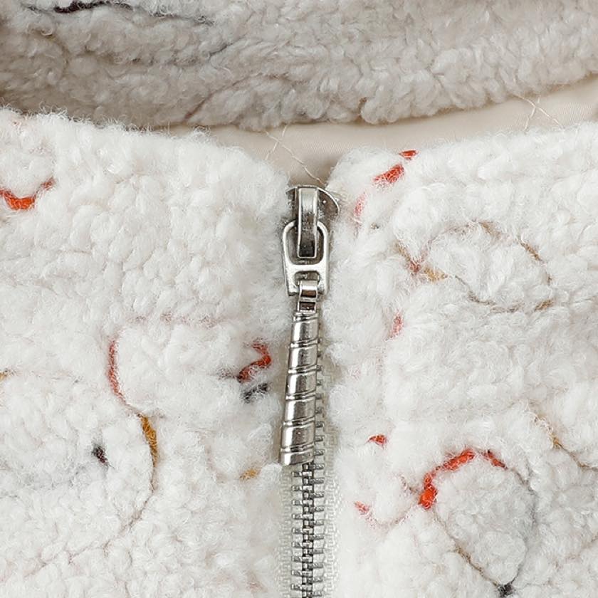 やさしいオフホワイトに手描き風のラインが織りなす表情が魅力のボアジャケット。