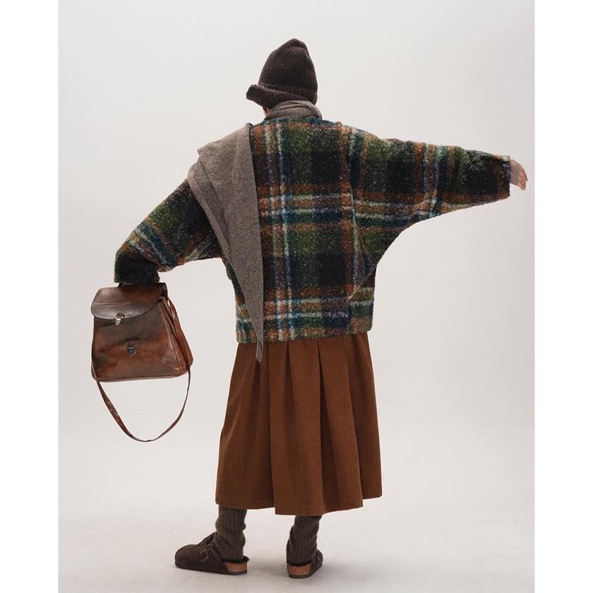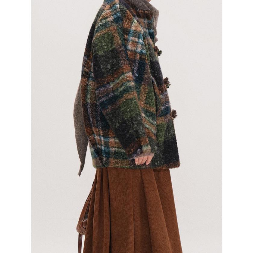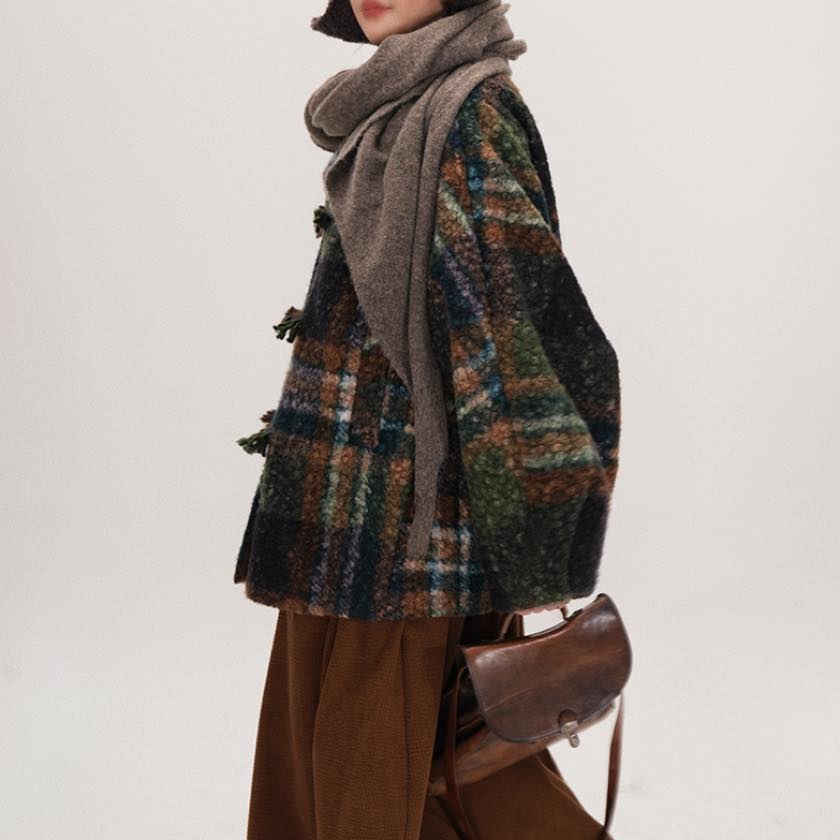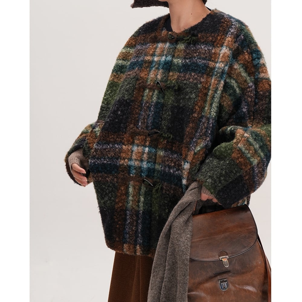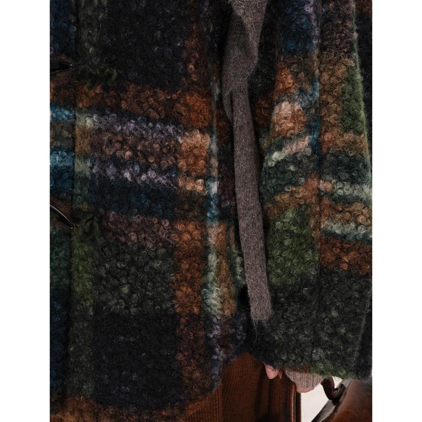 あたたかみのある素材感と、深みのある色の重なりが美しいチェックコート。