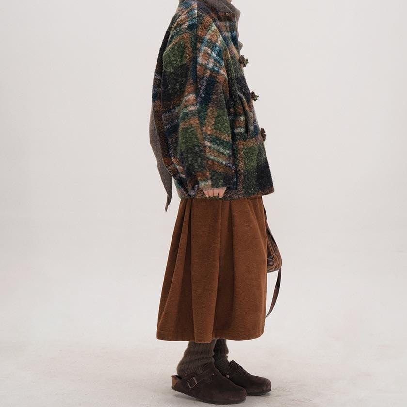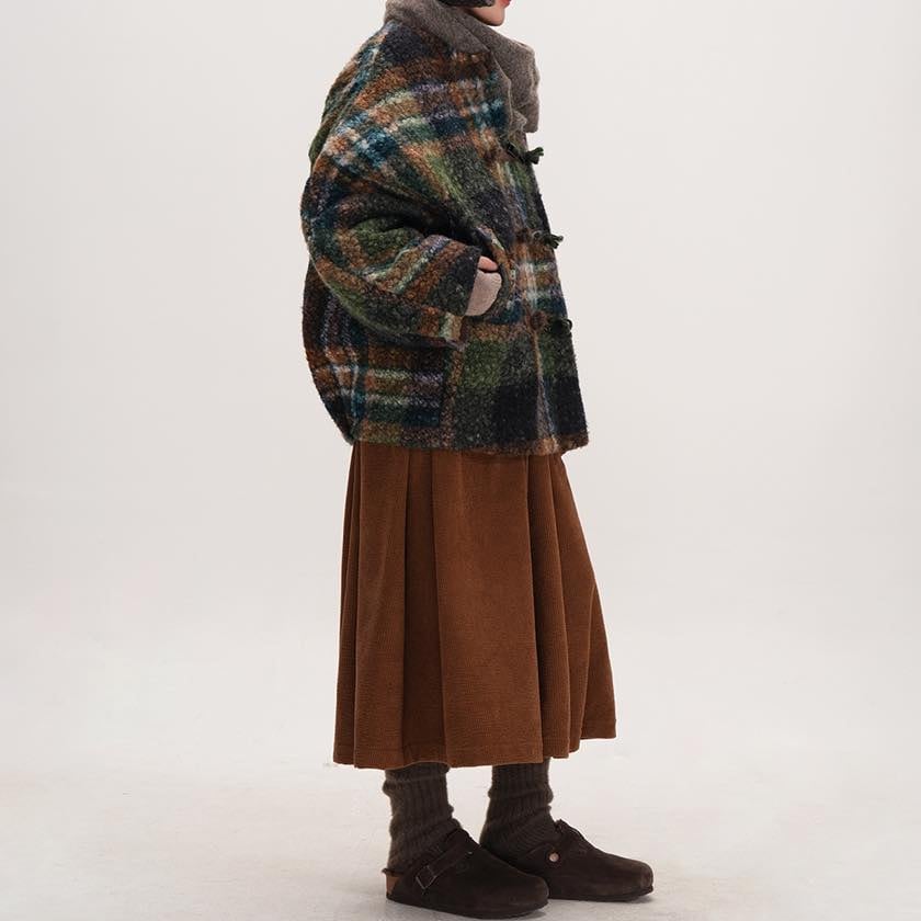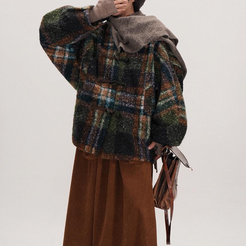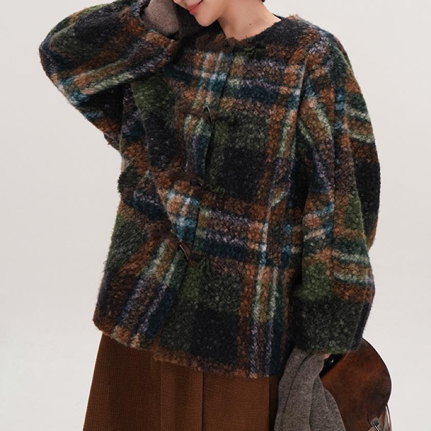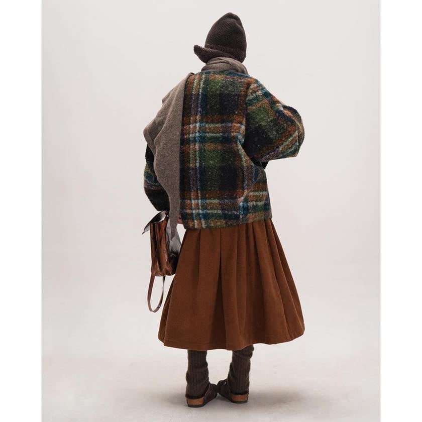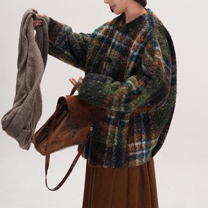 あたたかみのある素材感と、深みのある色の重なりが美しいチェックコート。