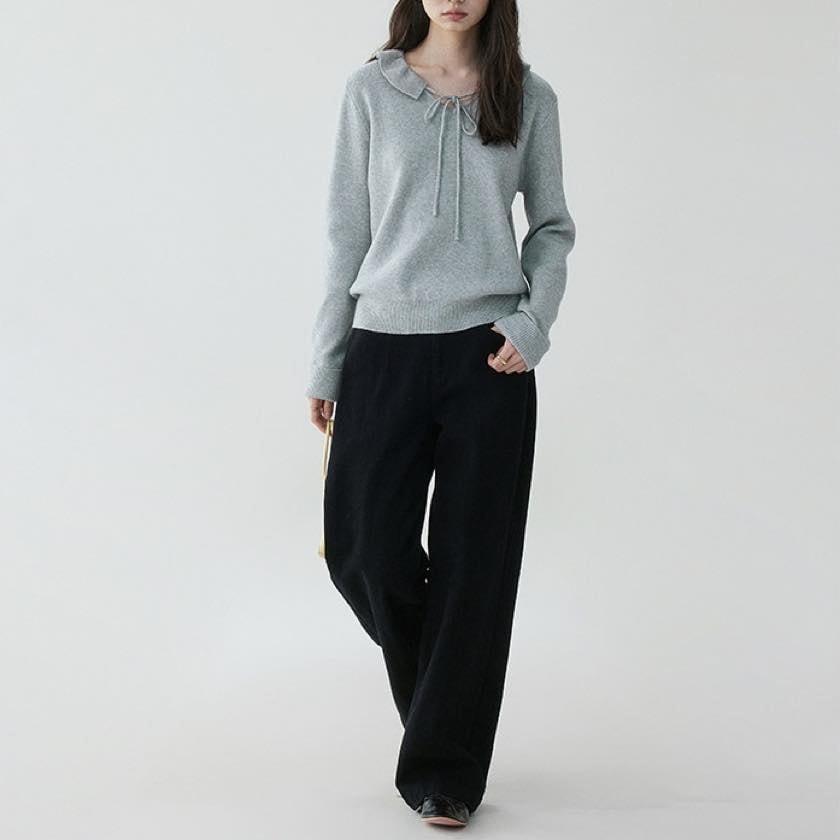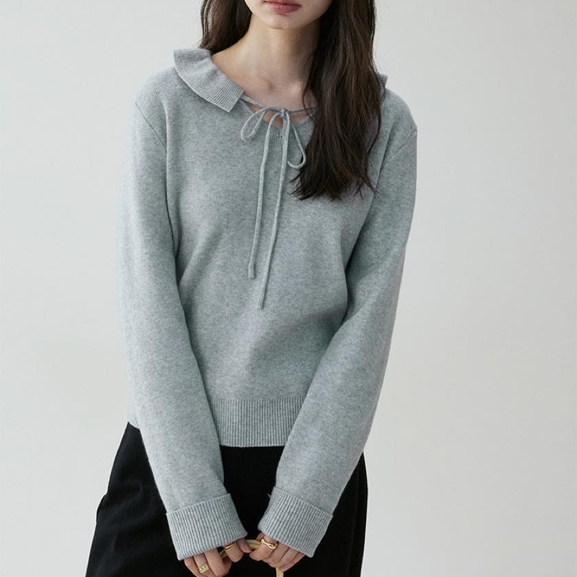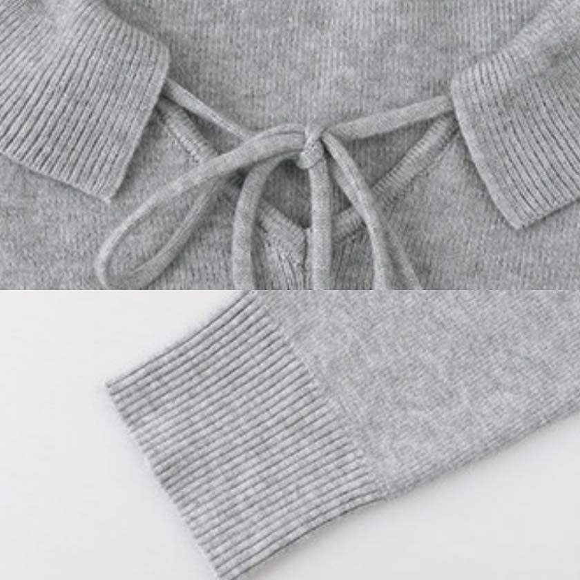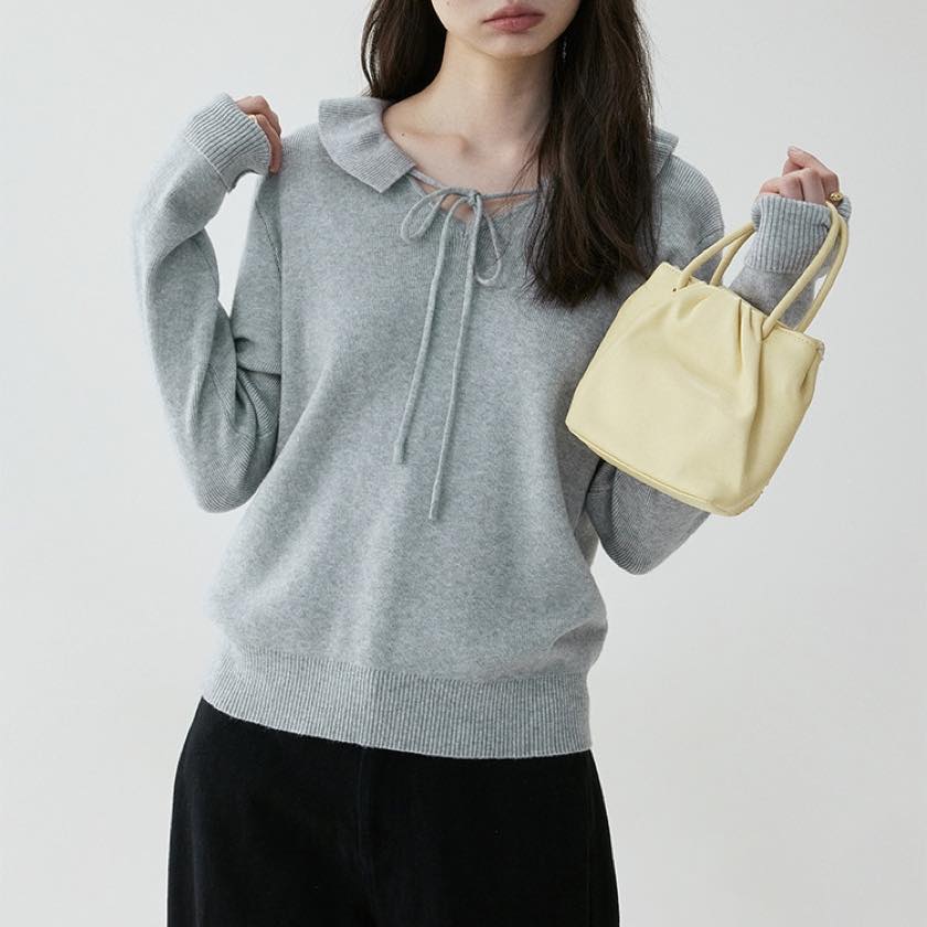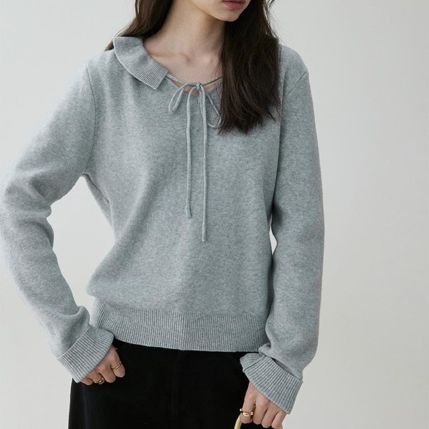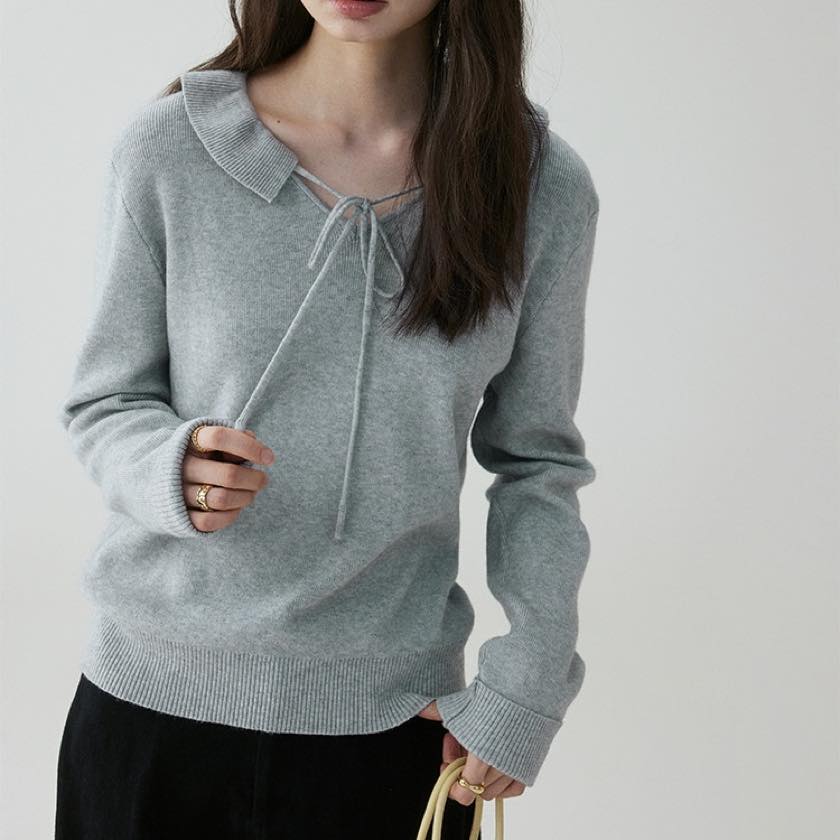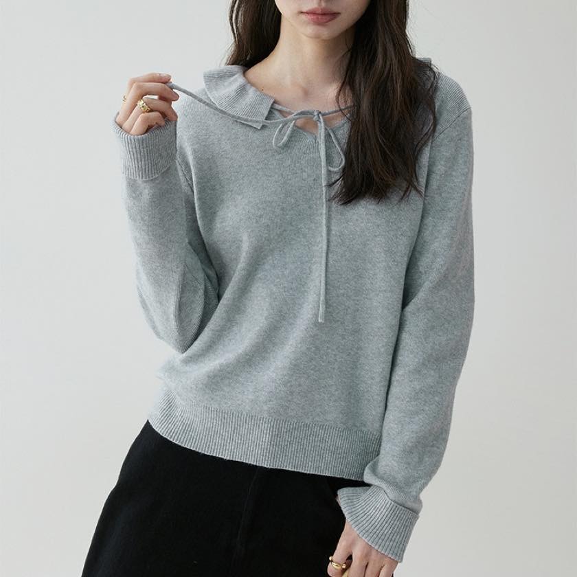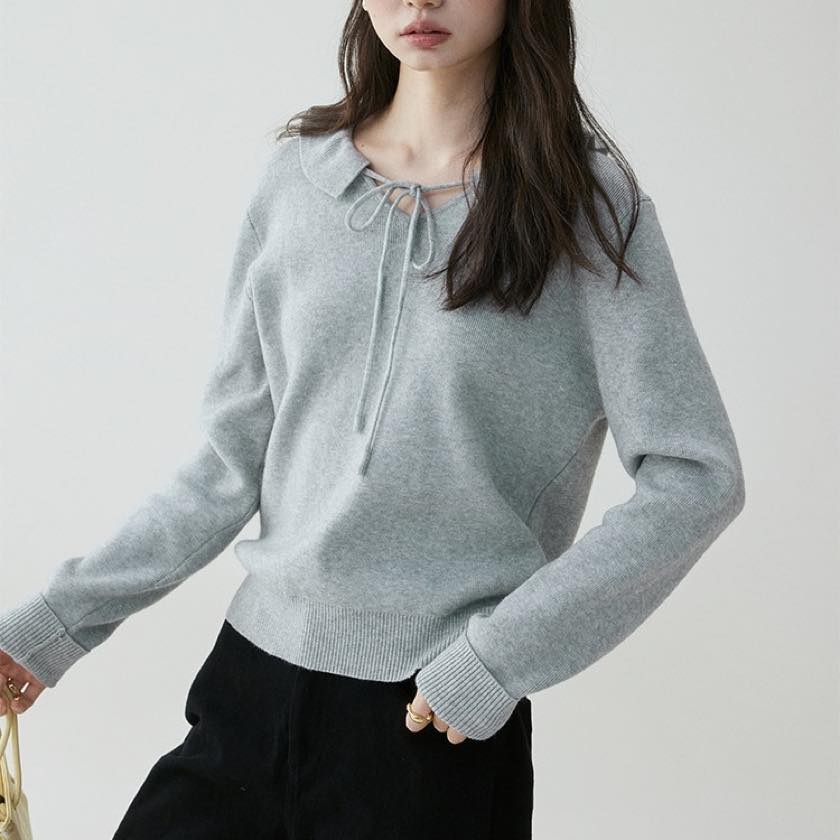 design collar ribbon tie knit tops