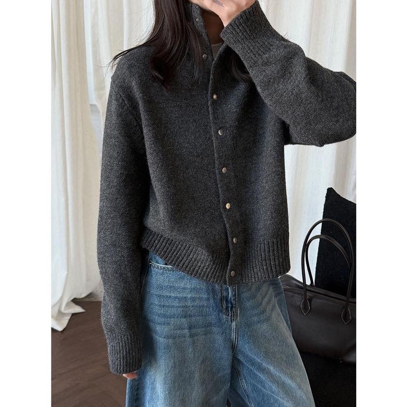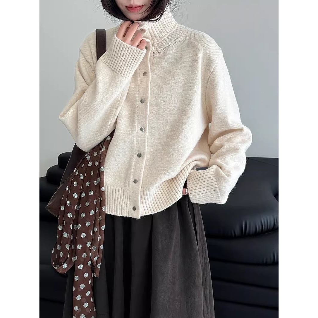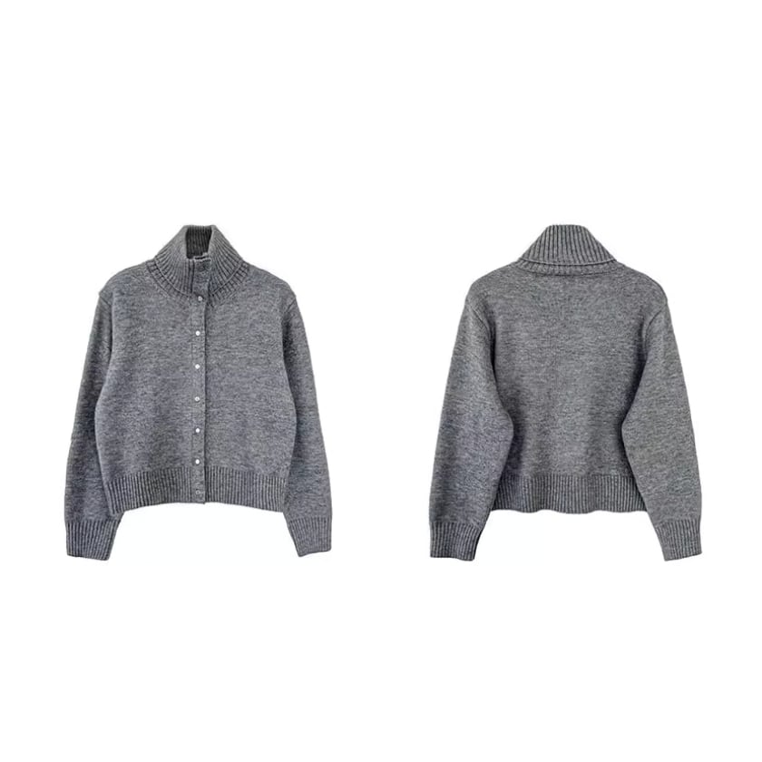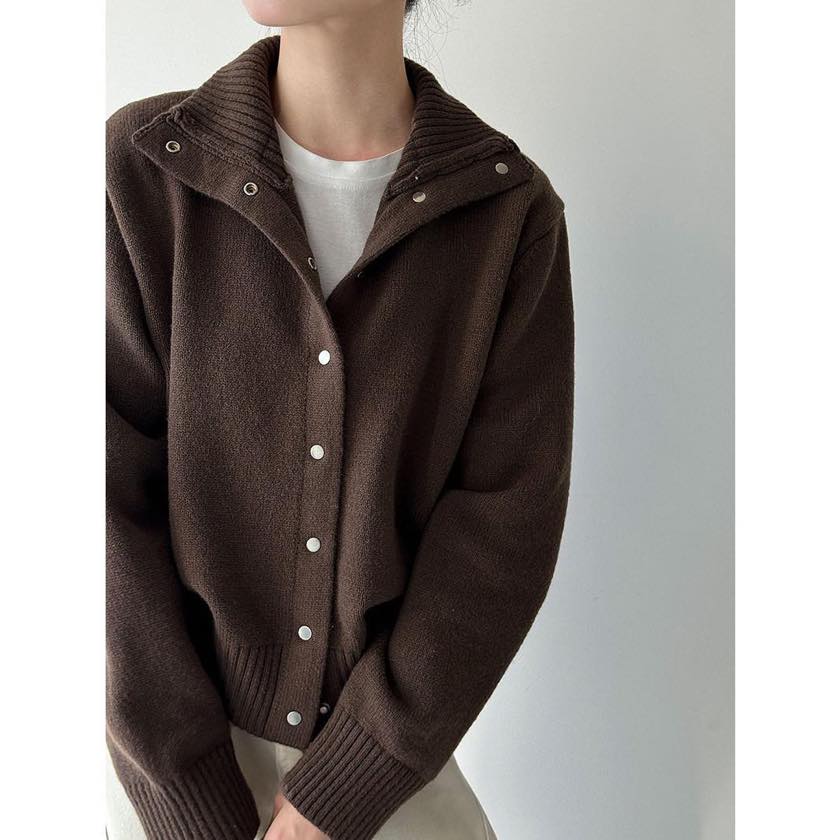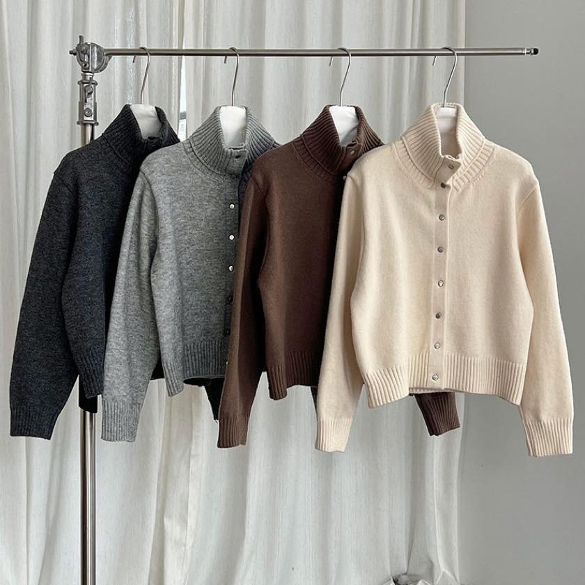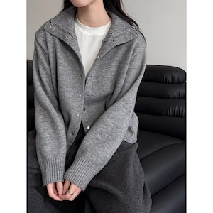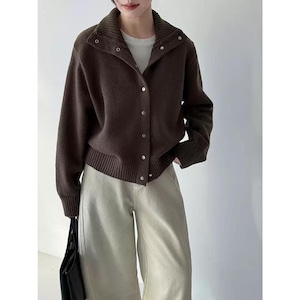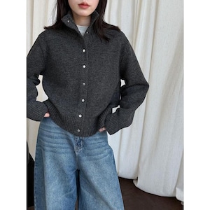 立体感のある襟元が印象的な、スタンドカラーカーディガン。
