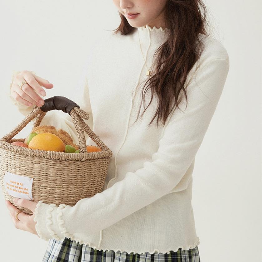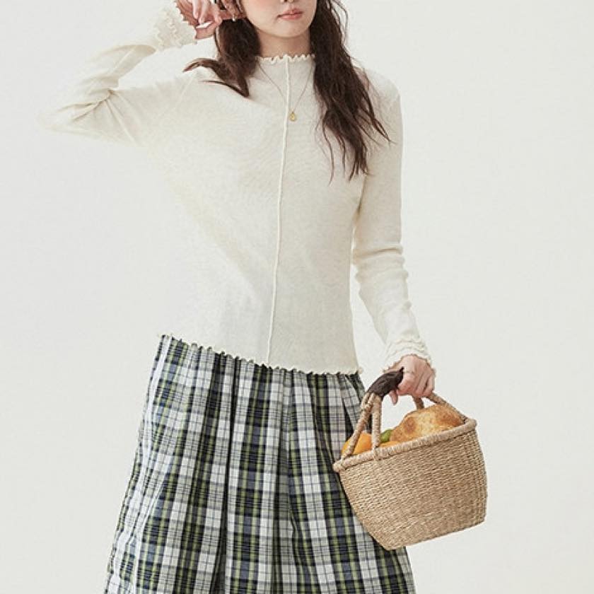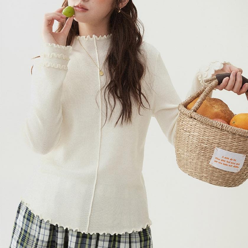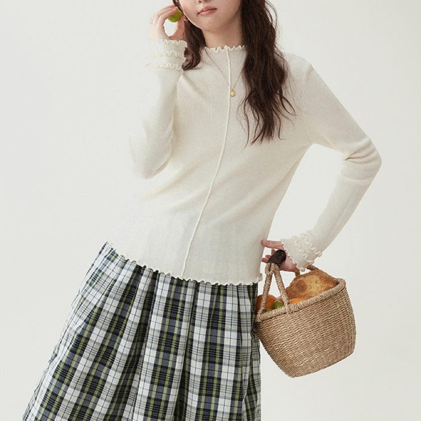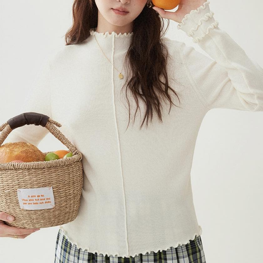 さりげないウェーブフリルが、柔らかな表情をプラスするニットトップス。