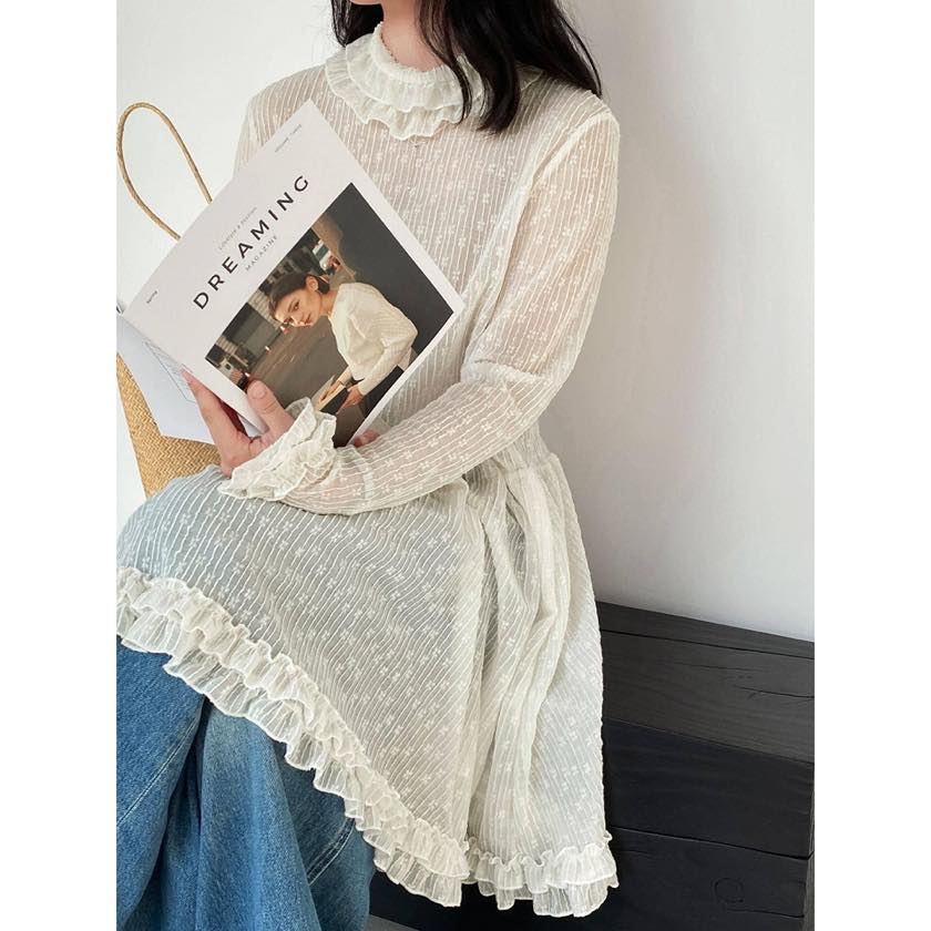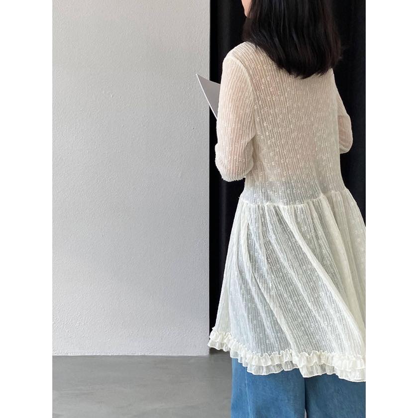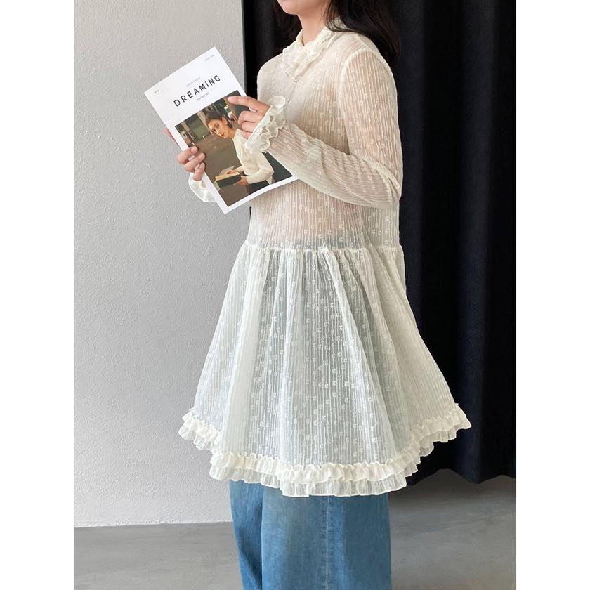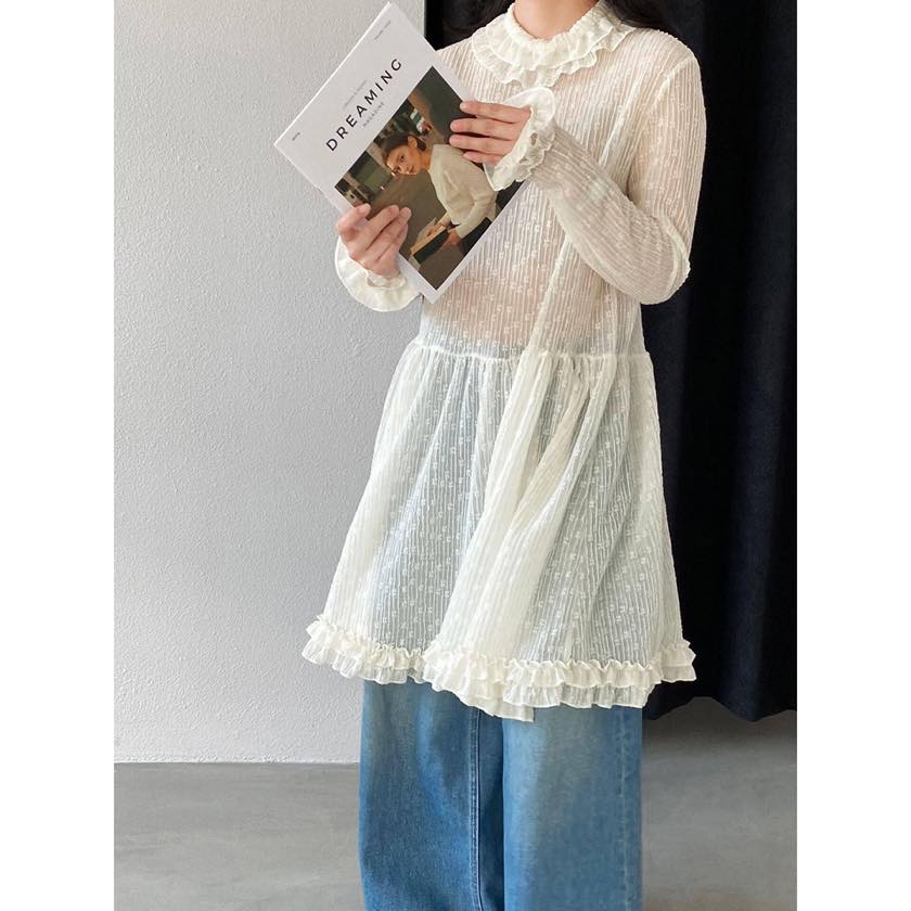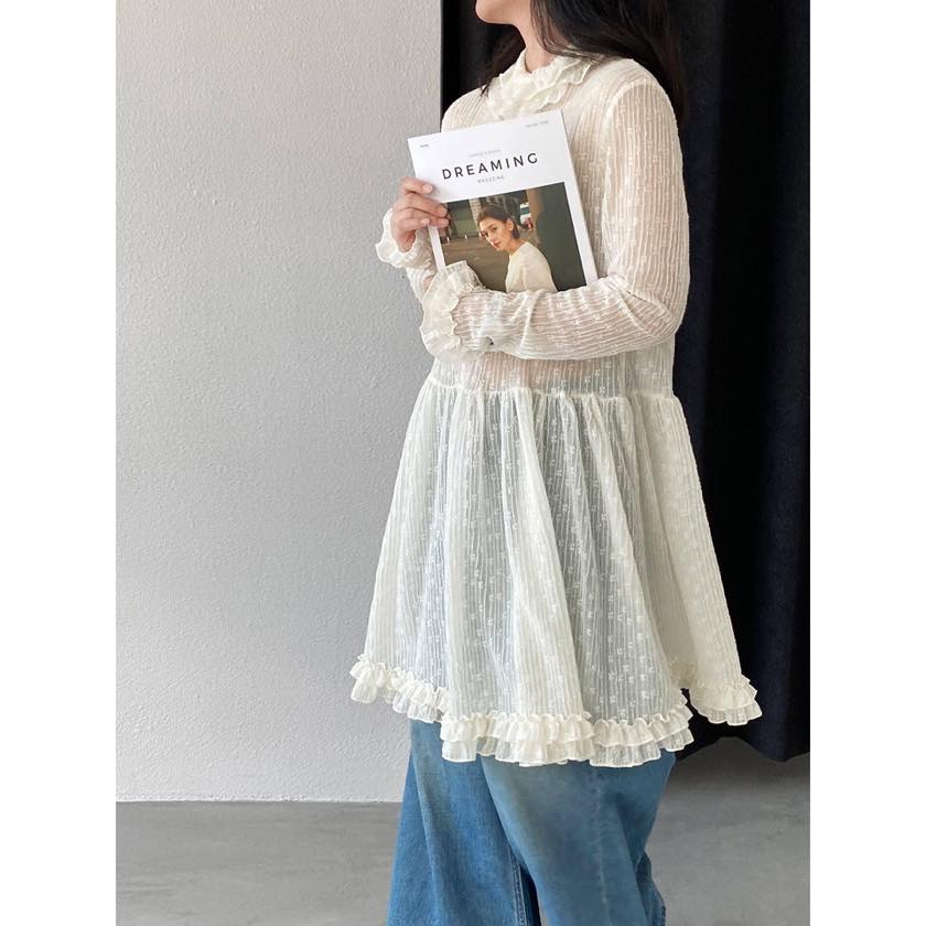 繊細なシアー素材に、フリルで女性らしい華やかさをプラスしたチュニックブラウス。