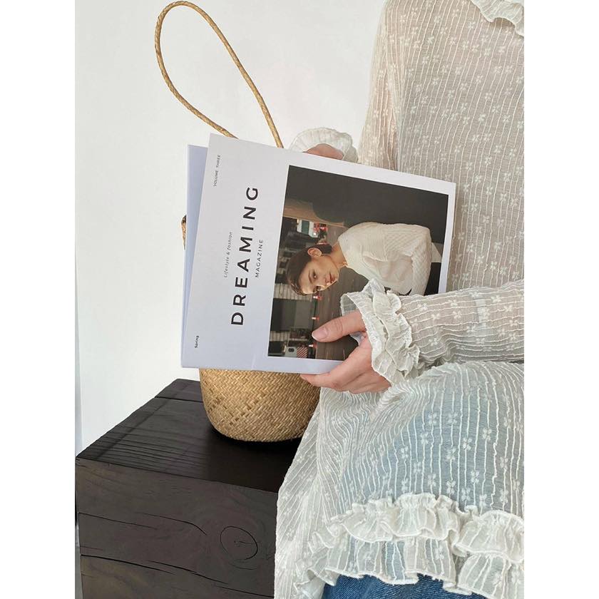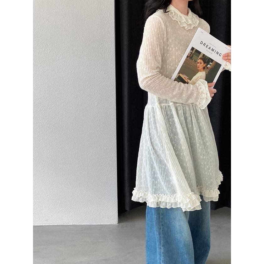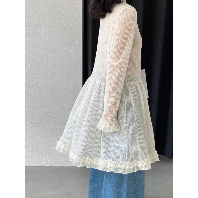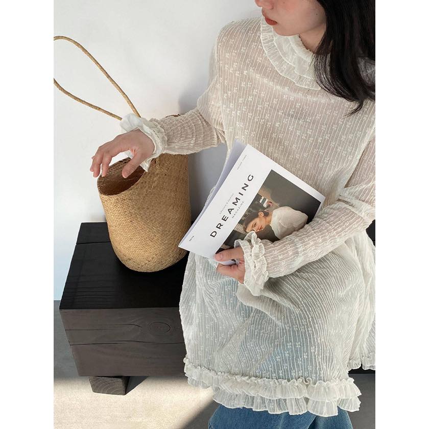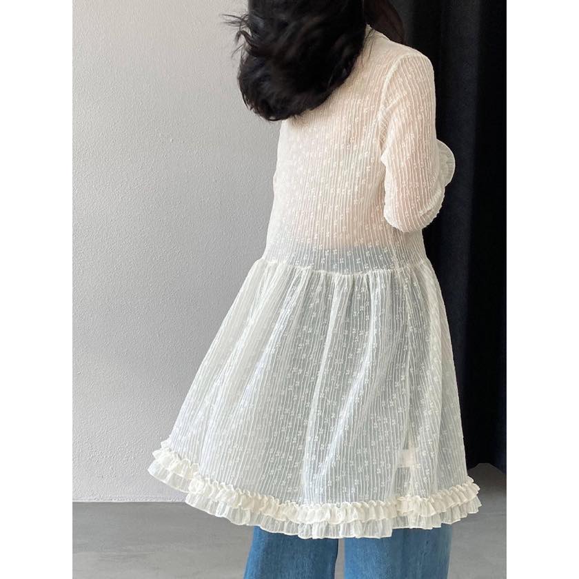 繊細なシアー素材に、フリルで女性らしい華やかさをプラスしたチュニックブラウス。