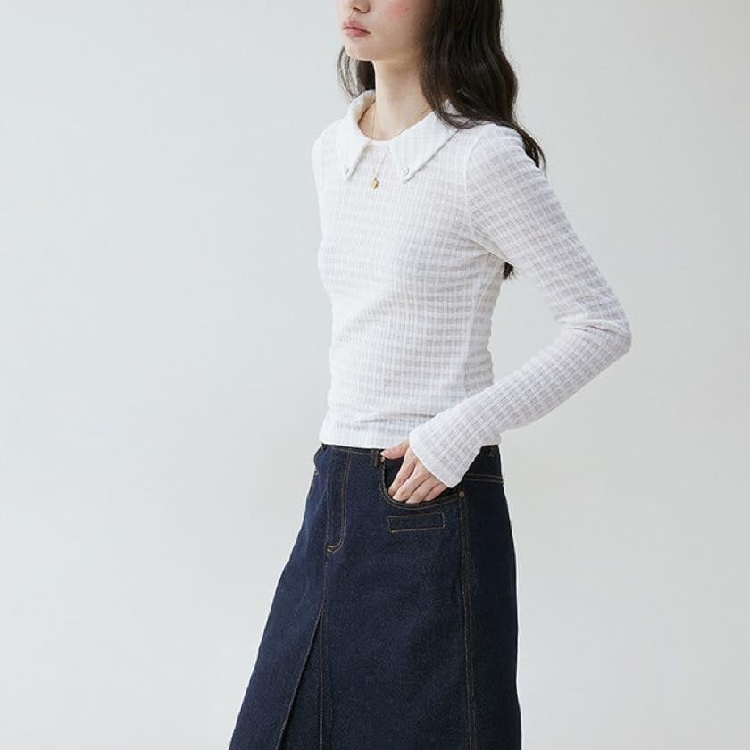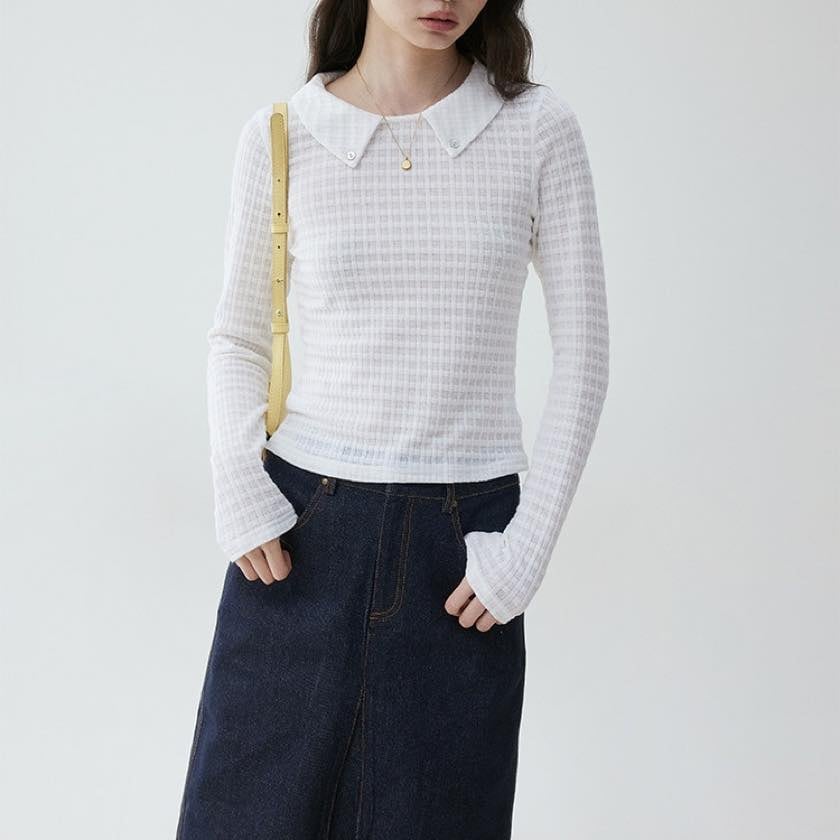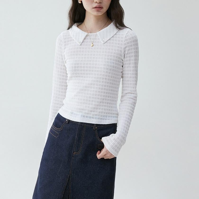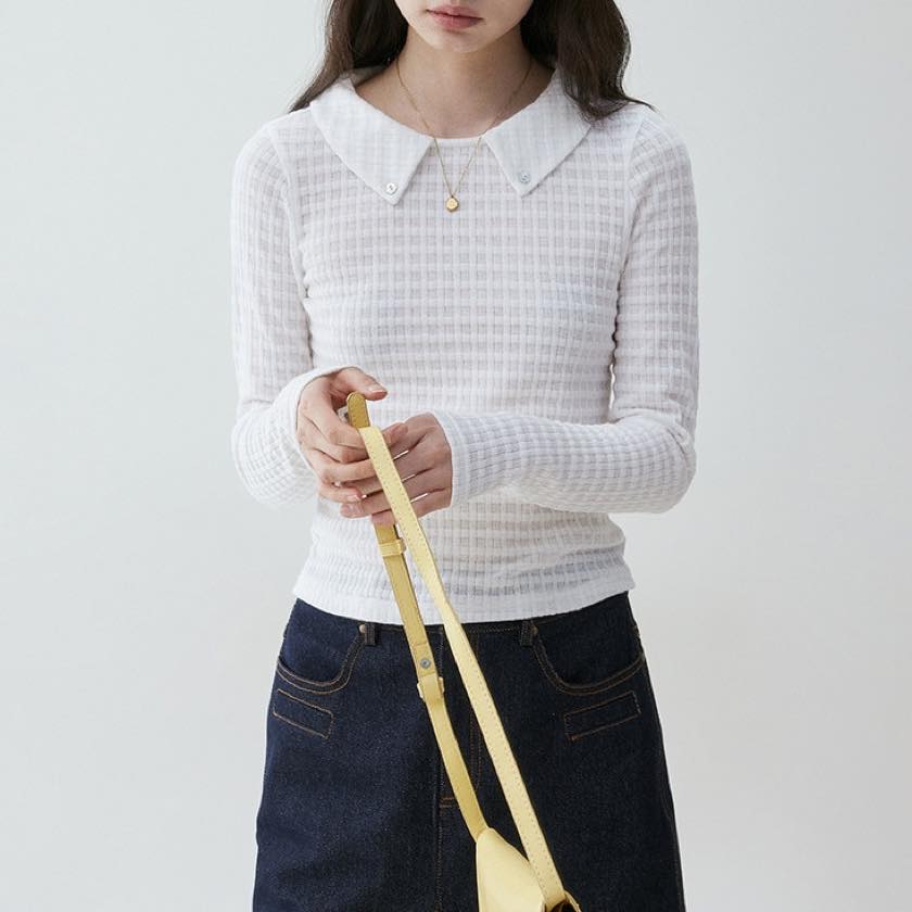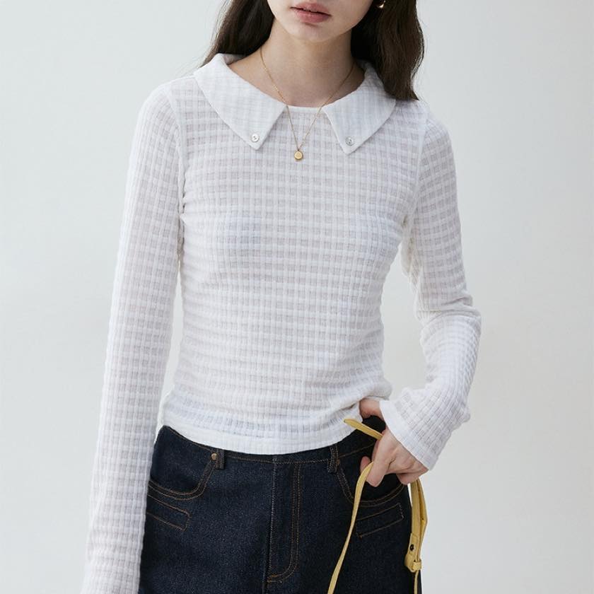 やさしい凹凸感のある素材に、小ぶりな襟を添えたデザイントップス。