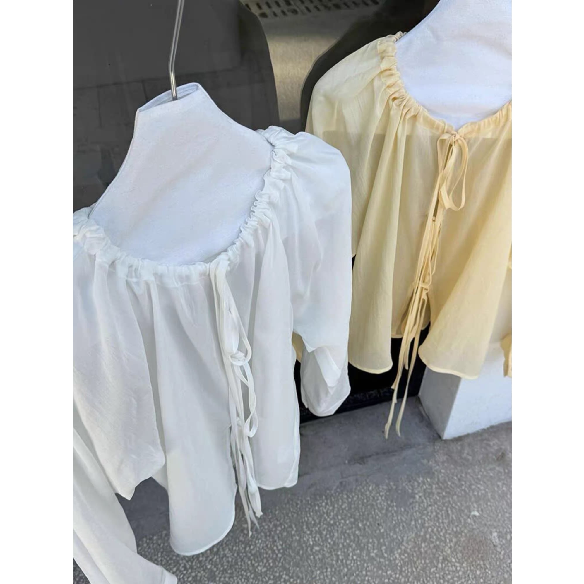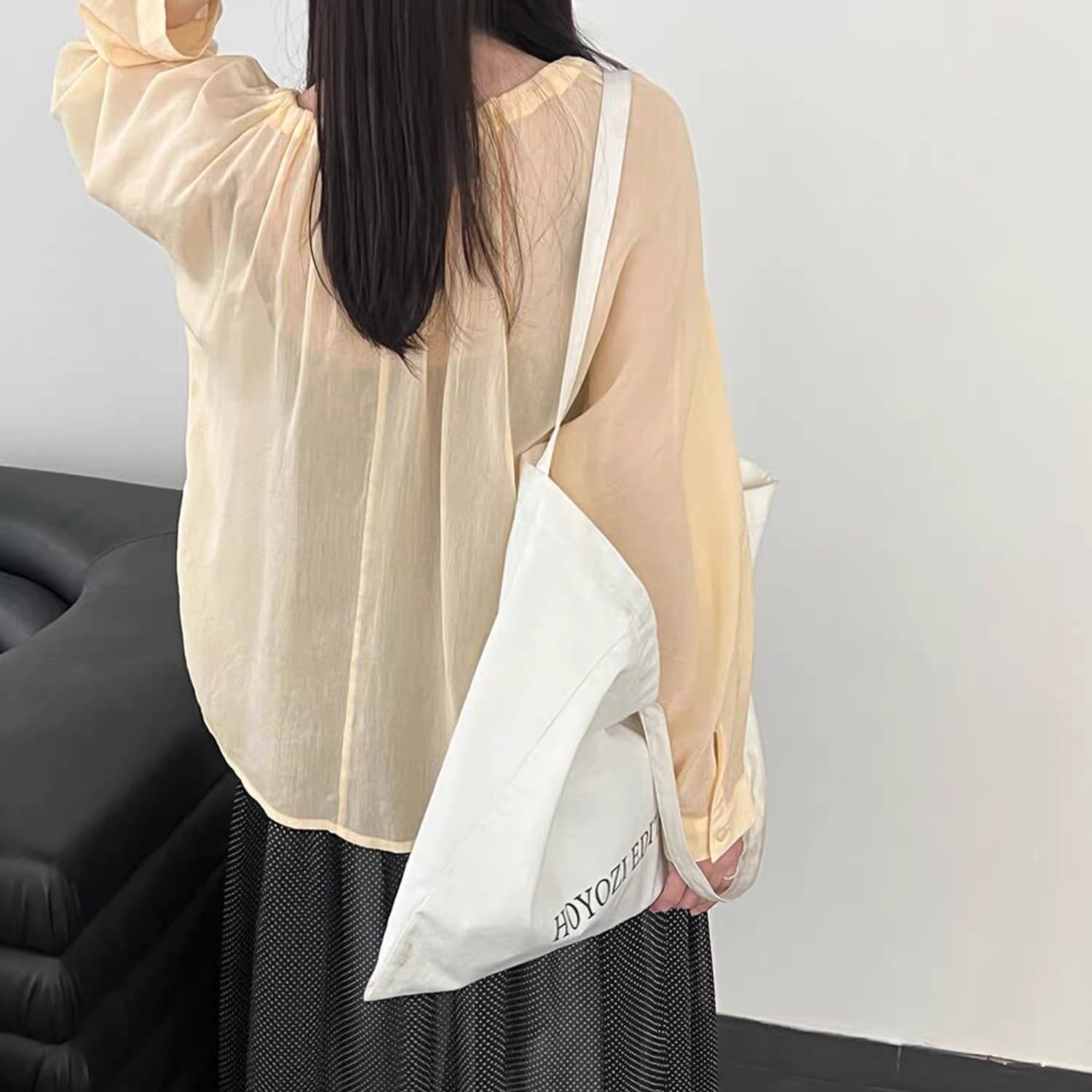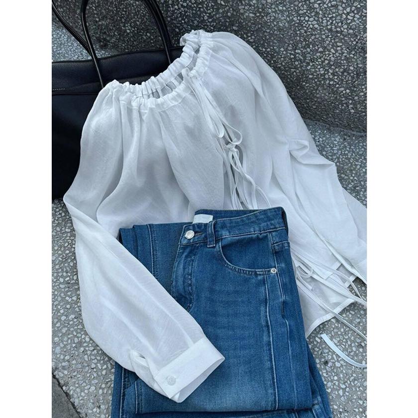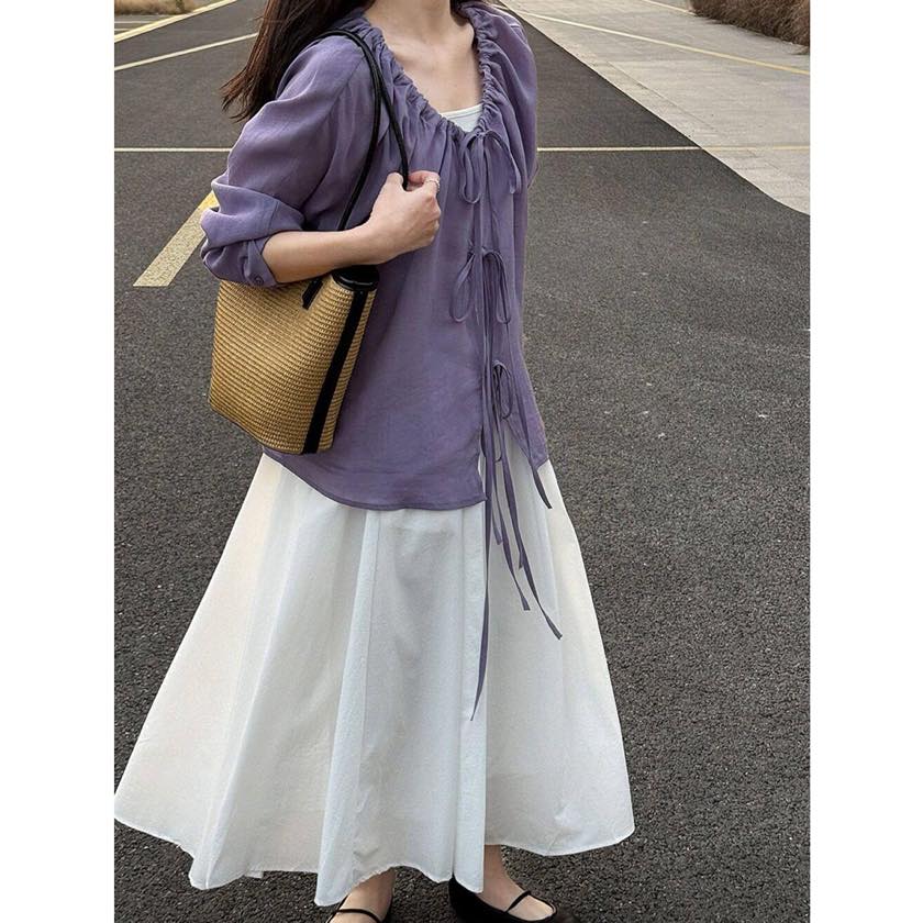 軽やかな素材感と、ギャザーを寄せたふんわりシルエットで、抜け感のあるスタイルに。
