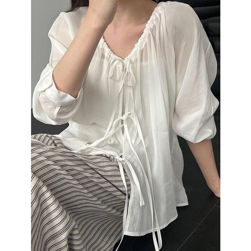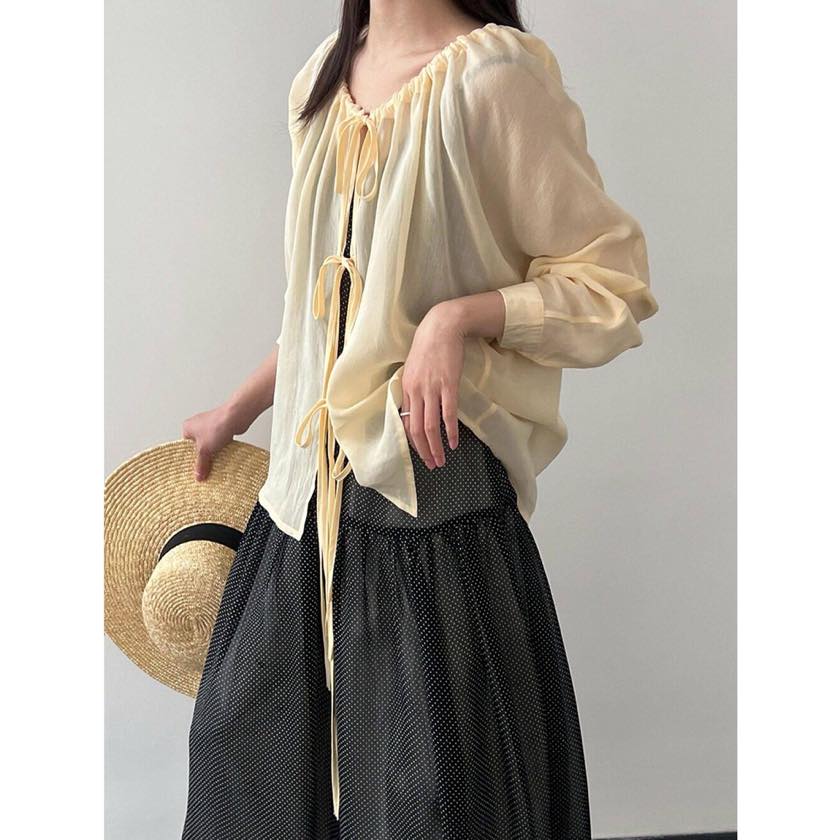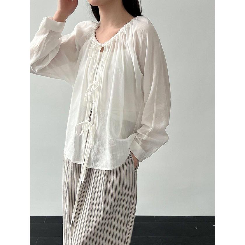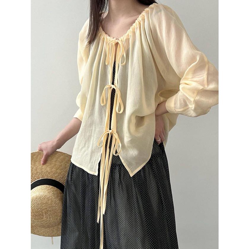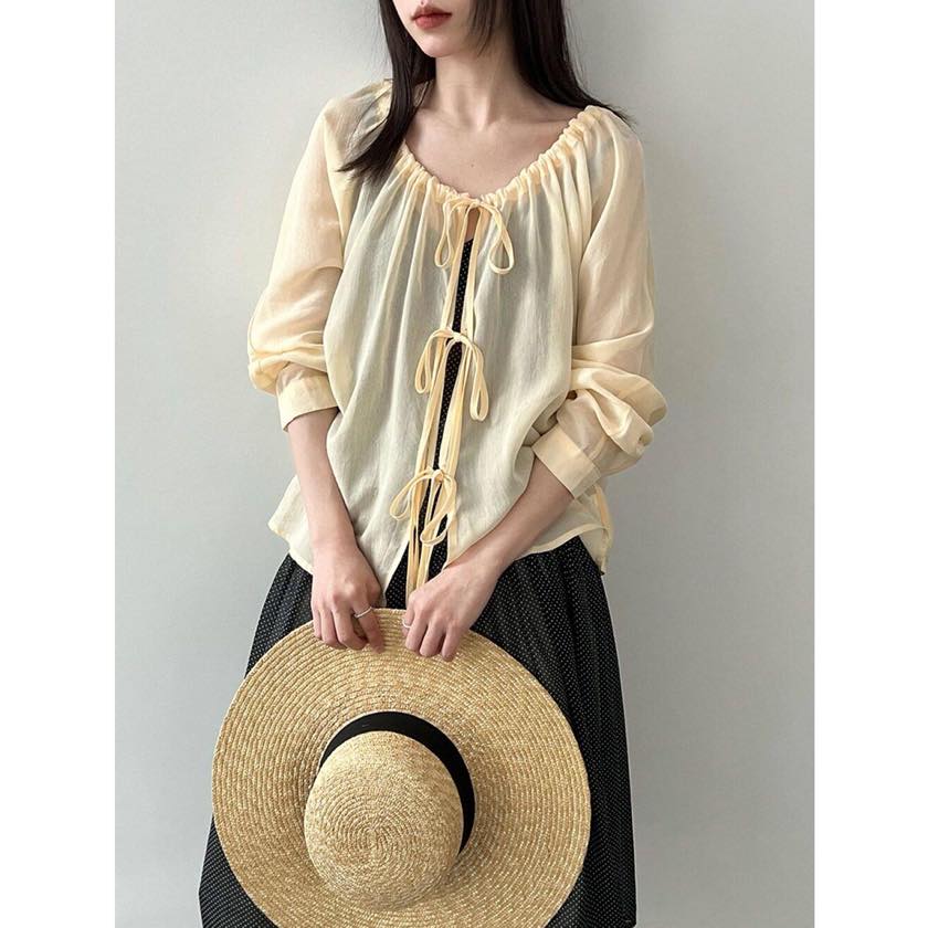 フロントのリボンディテールが女性らしい表情を作るデザインブラウス。