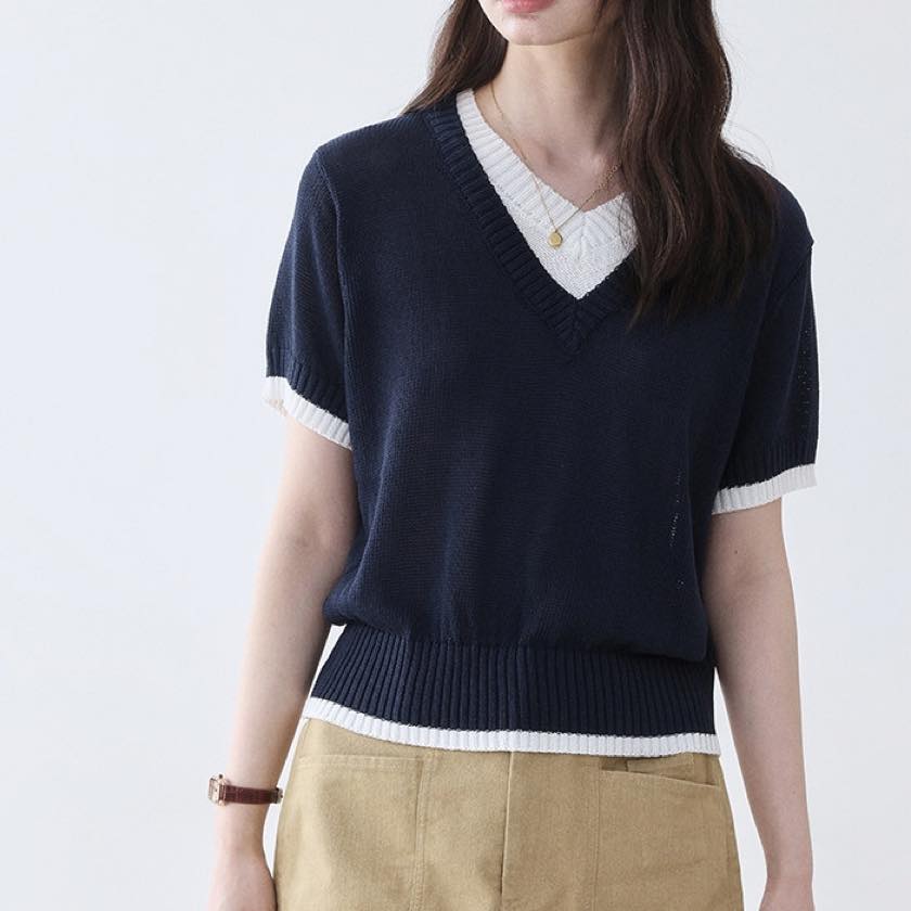 Vネックの抜け感に、さりげない配色のコントラスト。