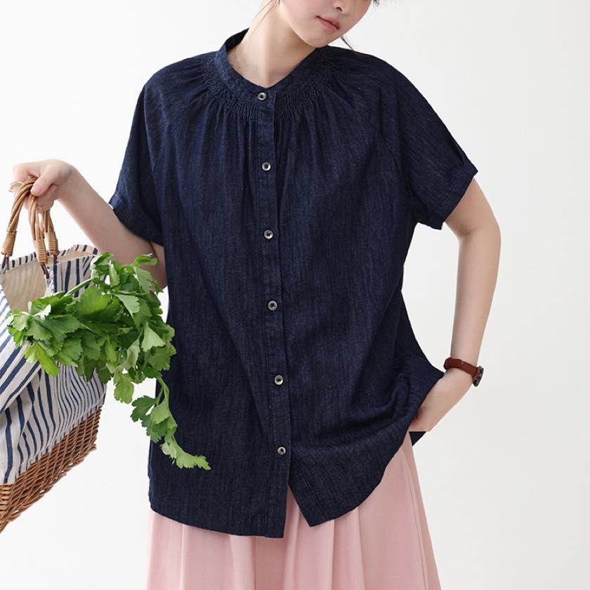 gathered band collar denim blouse
