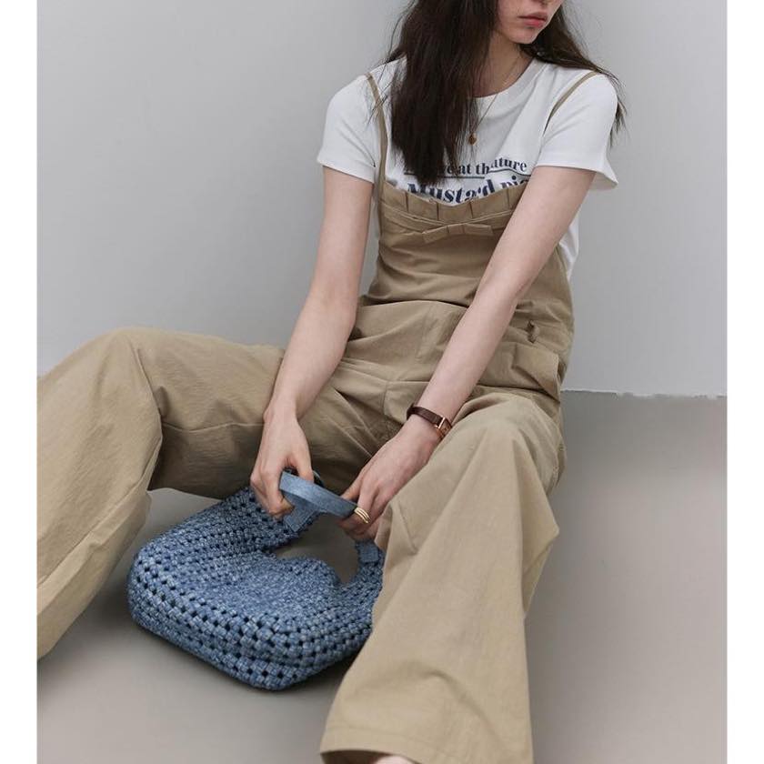 華奢なストラップと、程よくゆとりのあるストレートシルエットが、抜け感を生むサロペット。