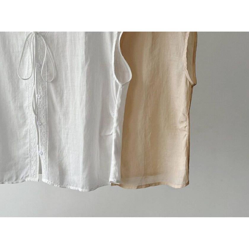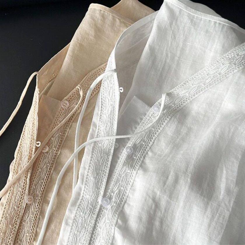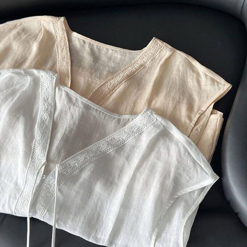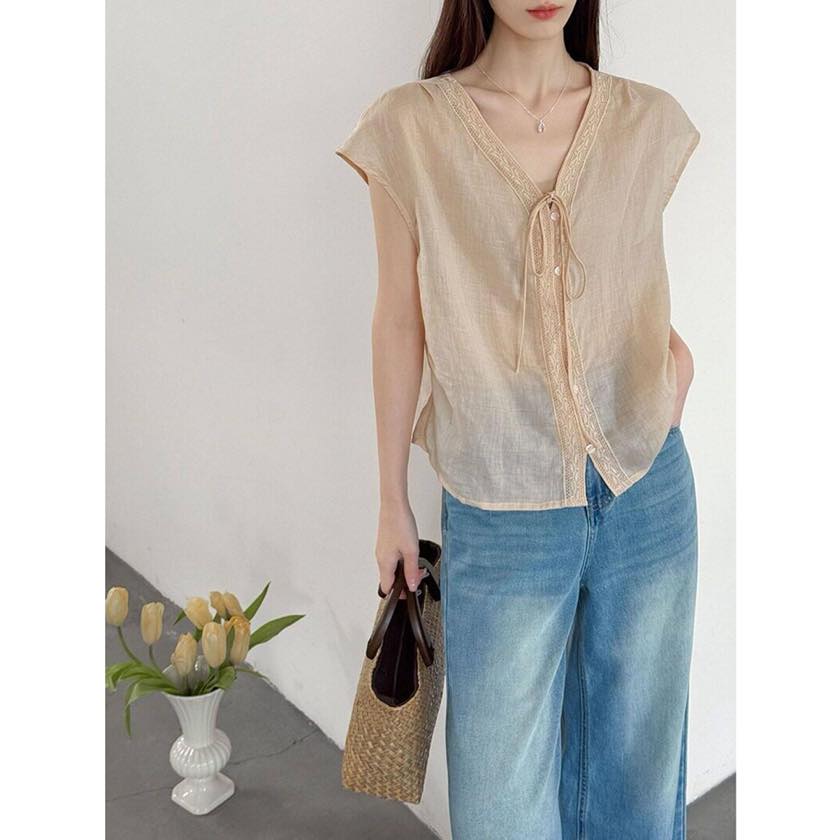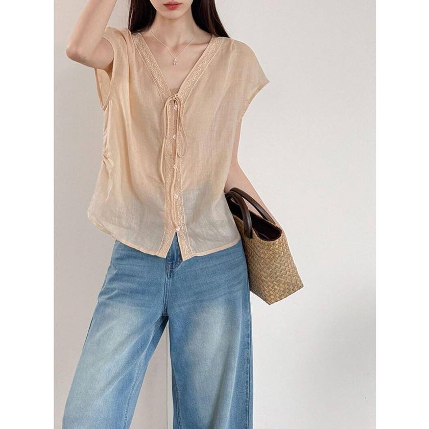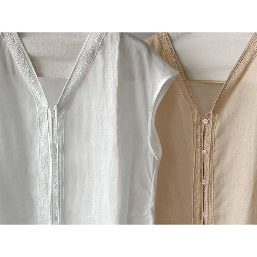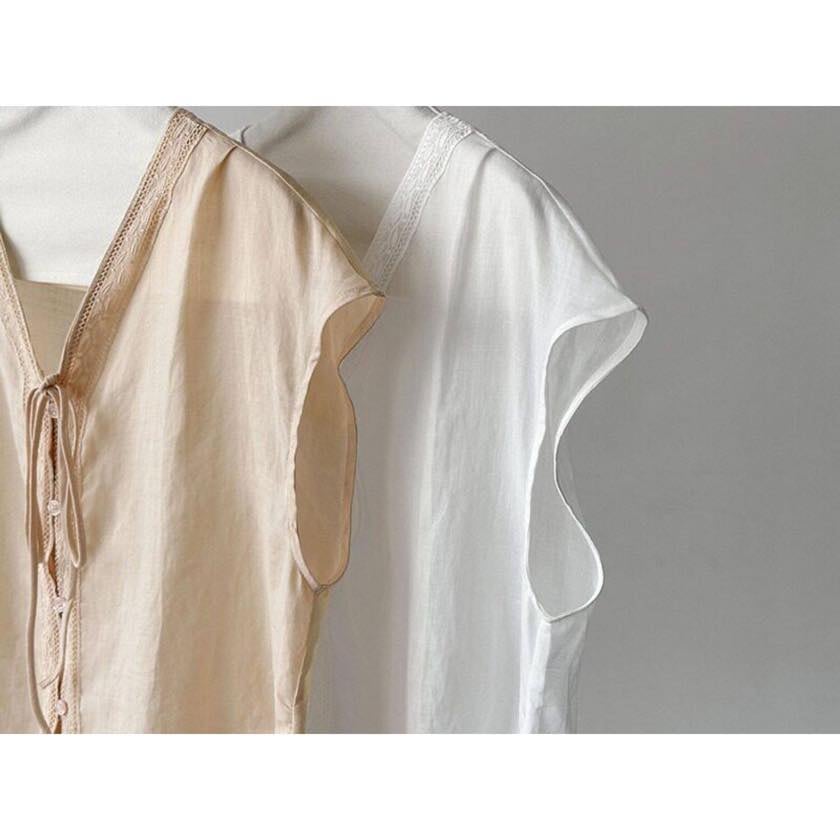 繊細なレーストリムがアクセントのVネックブラウス。