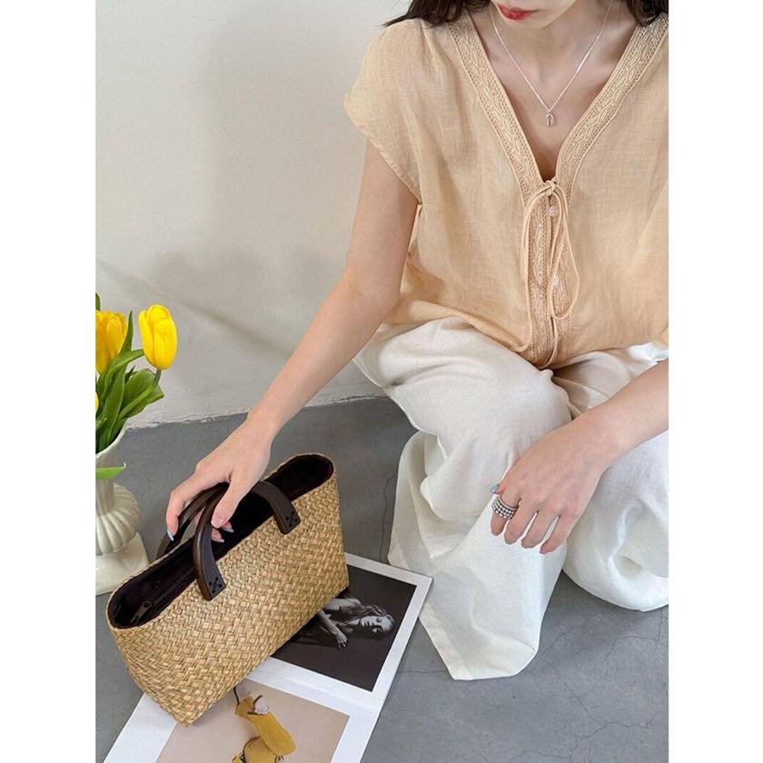 フロントボタンとリボンディテールが、さりげない女性らしさをプラスします。