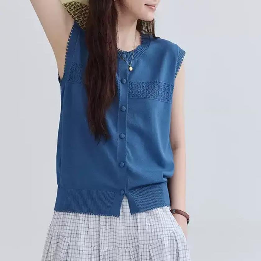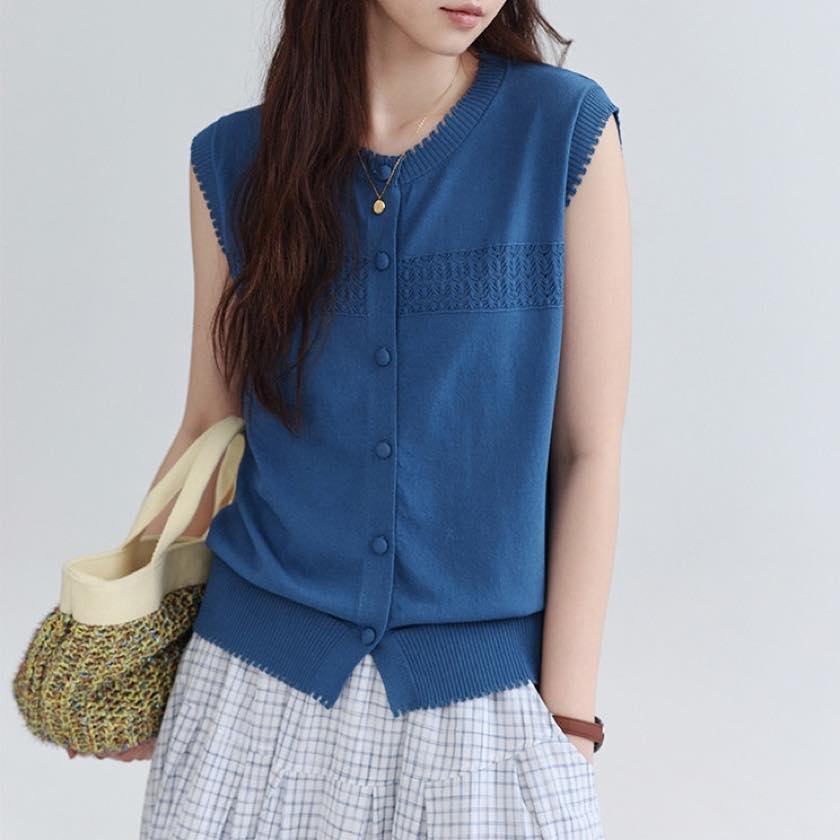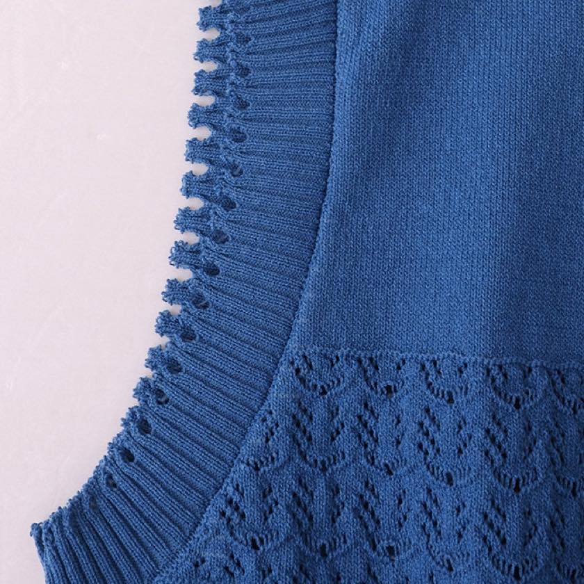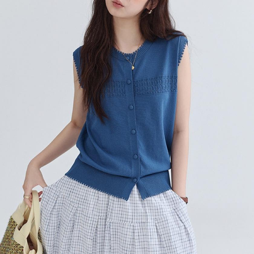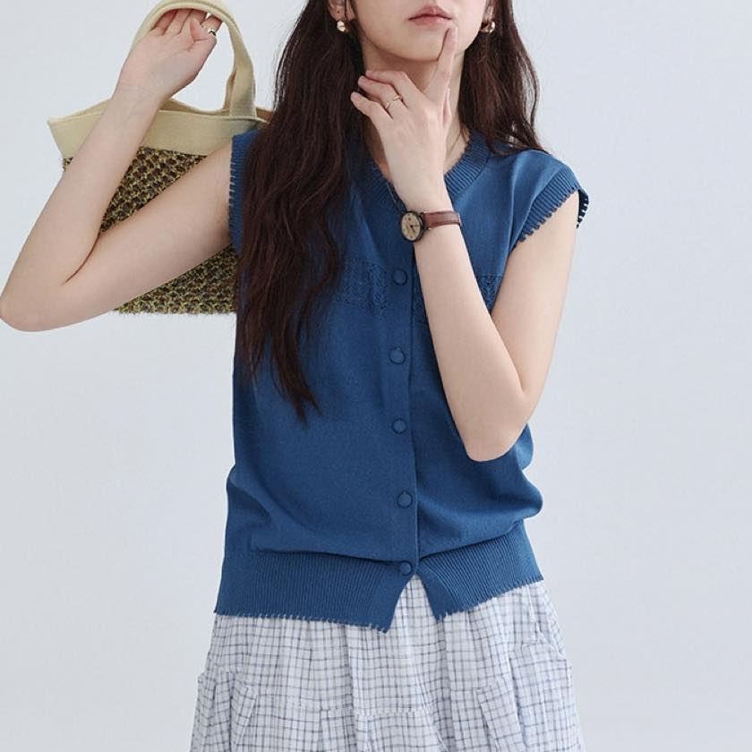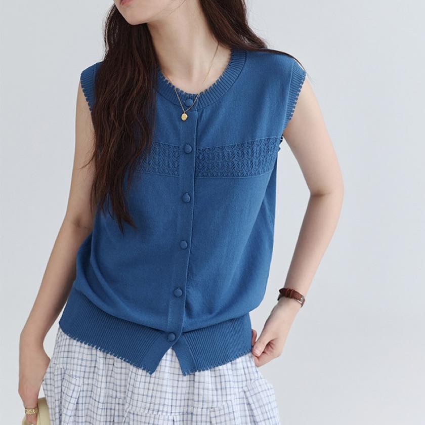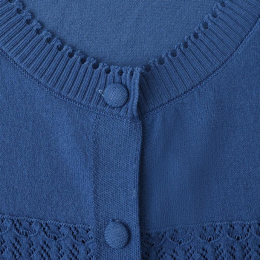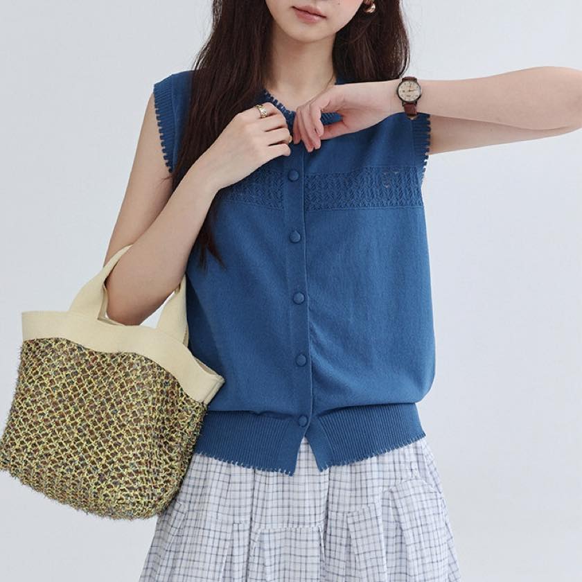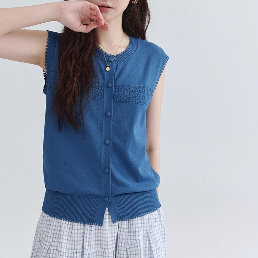 繊細な透かし編みのパネルが目を引くニットトップス。