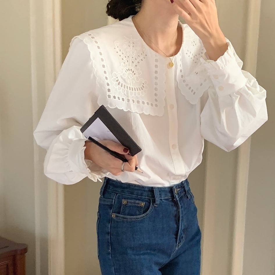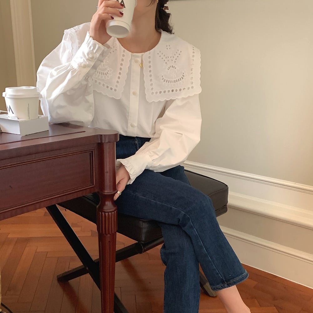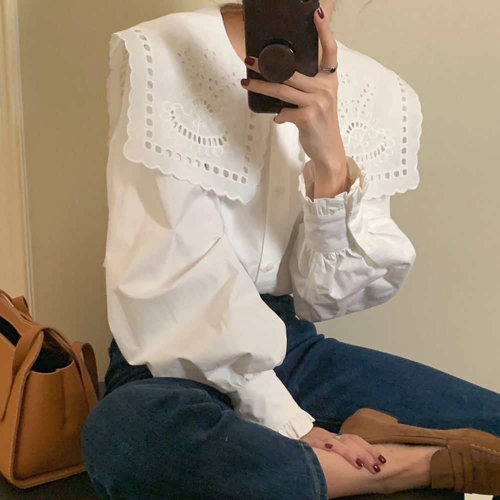 カットワークにこだわったビッグカラーが目を惹く一着。ふんわりパフスリーブも可愛いポイント。一枚で着映える主役級アイテムです。