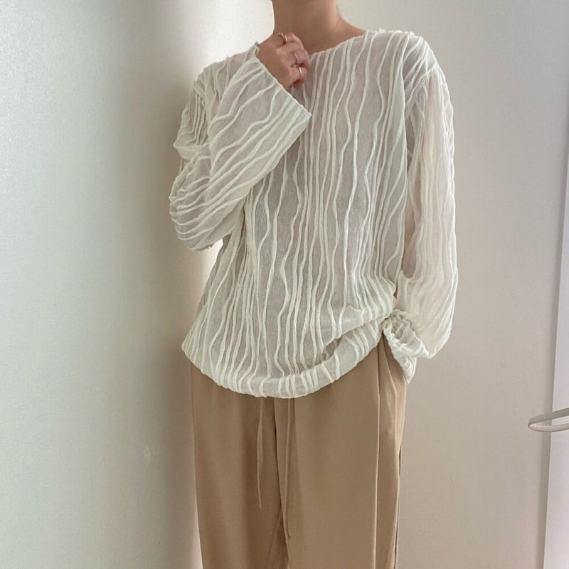 やや透け感のある立体的なテクスチャで、コーデに大人の抜け感を演出するトップス。