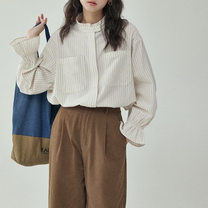 フリルのスタンドカラーに、キャンディスリーブが可愛いストライプシャツ。